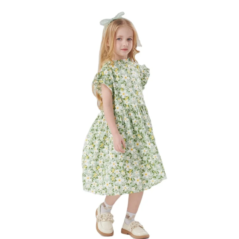 Kids Wear Wholesale Girls Clothes Fashion Pure Cotton Stand Collar Flying Sleeve Floral Girl Dresses for Girls
