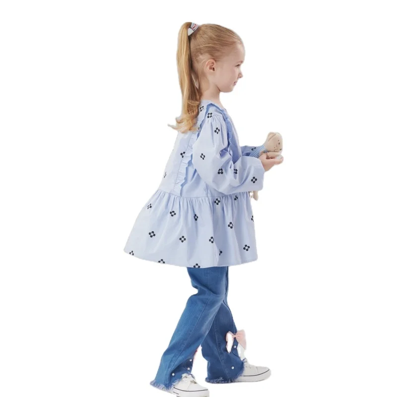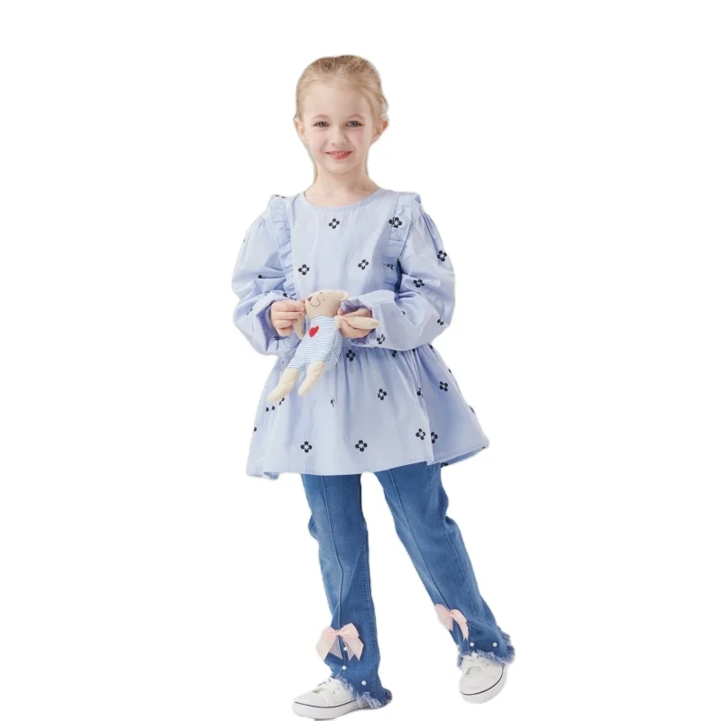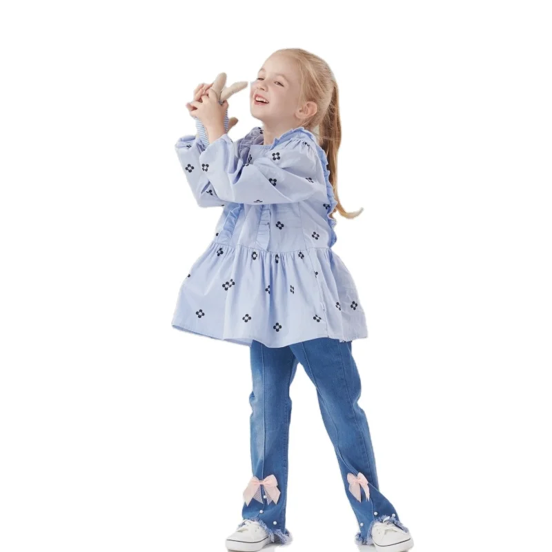 New Spring Girls Fashion Korean-Clothes Casual Pleating Loose Long Sleeve Shirt Bell Bottoms Jeans 2 Piece Girls Clothing Sets