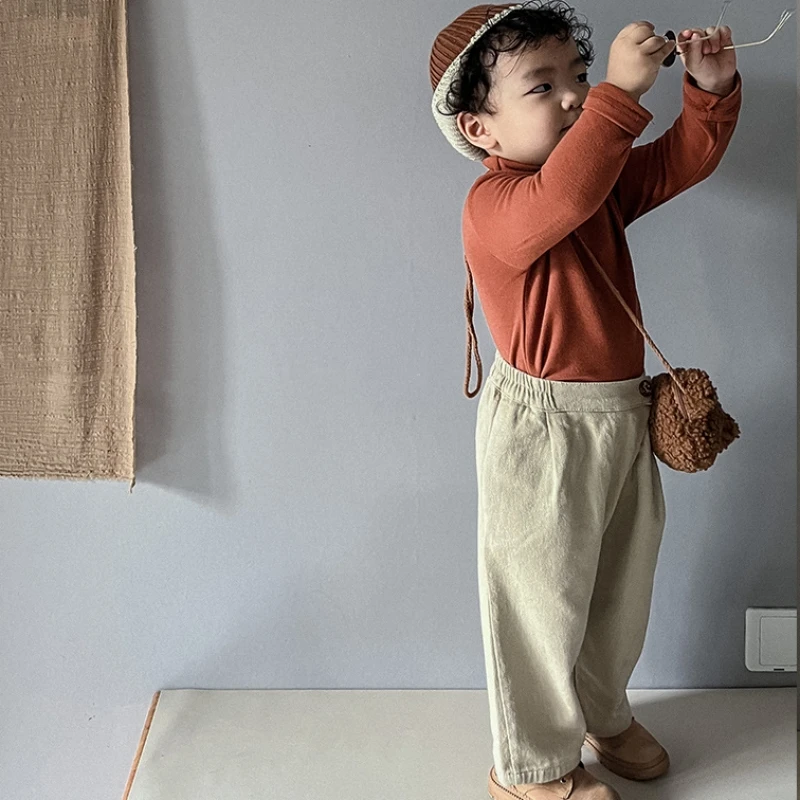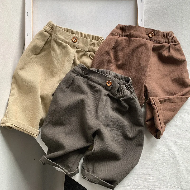 Autumn New Unisex Cropped Wide-Leg Trousers Pants for Boys and Girls Solid Color Washed Technique