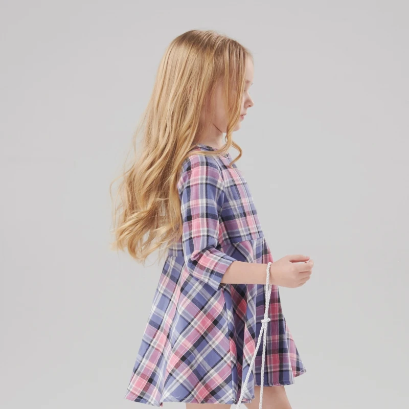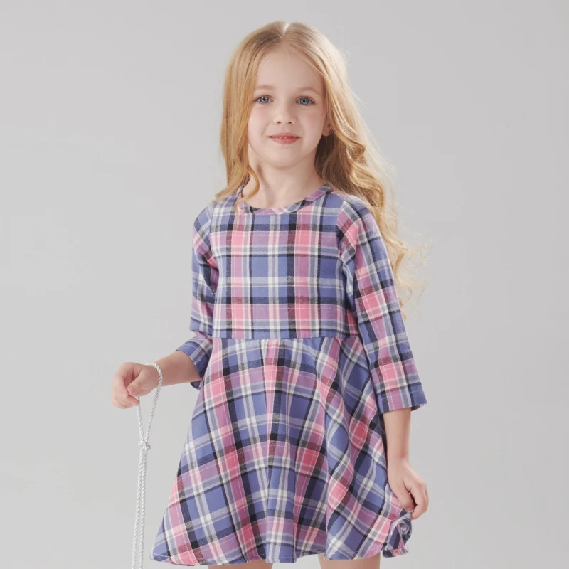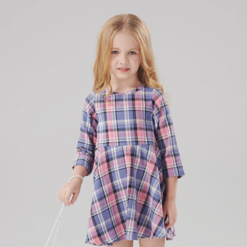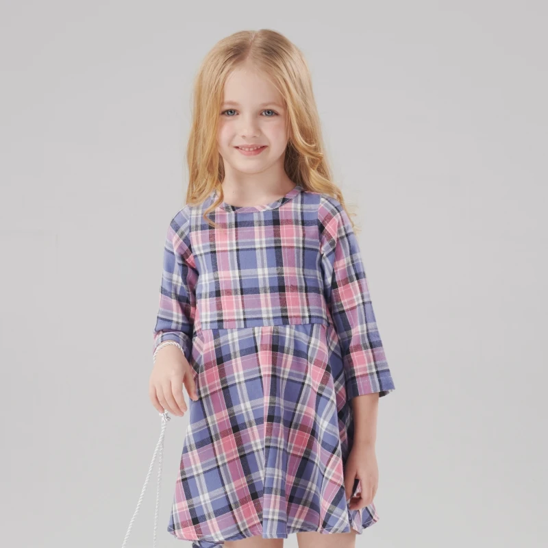 Custom Logo Kids Round Neck Long Sleeves Plaid Girls Dress