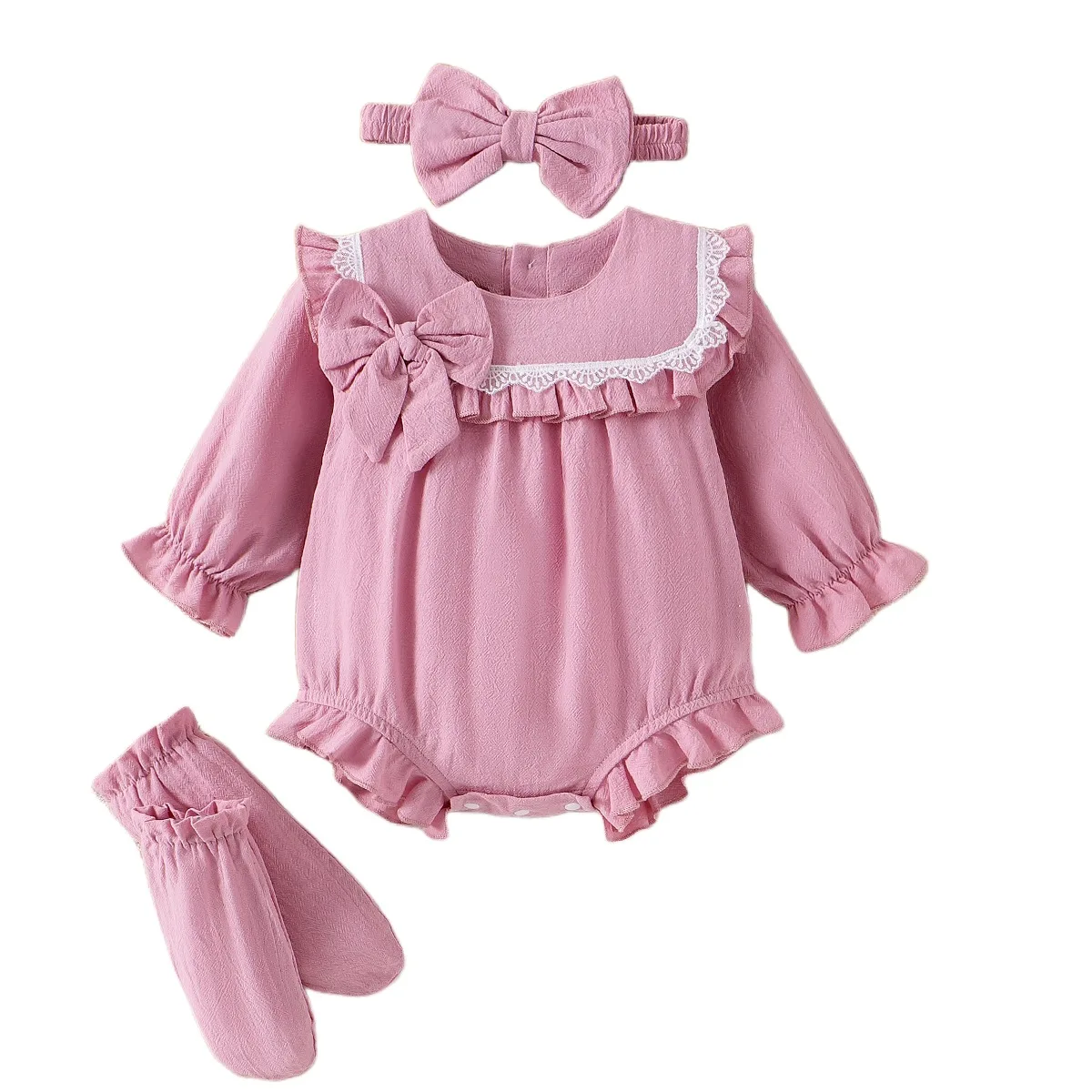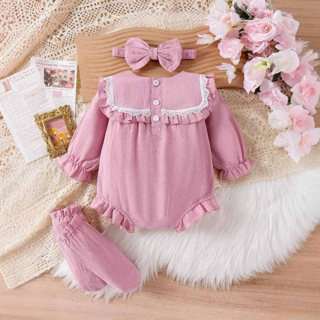 Autumn Cute Knitted Long-Sleeved Baby Romper Fashion 3-Piece Set with Bow Headband and Socks Wholesale Baby Clothing