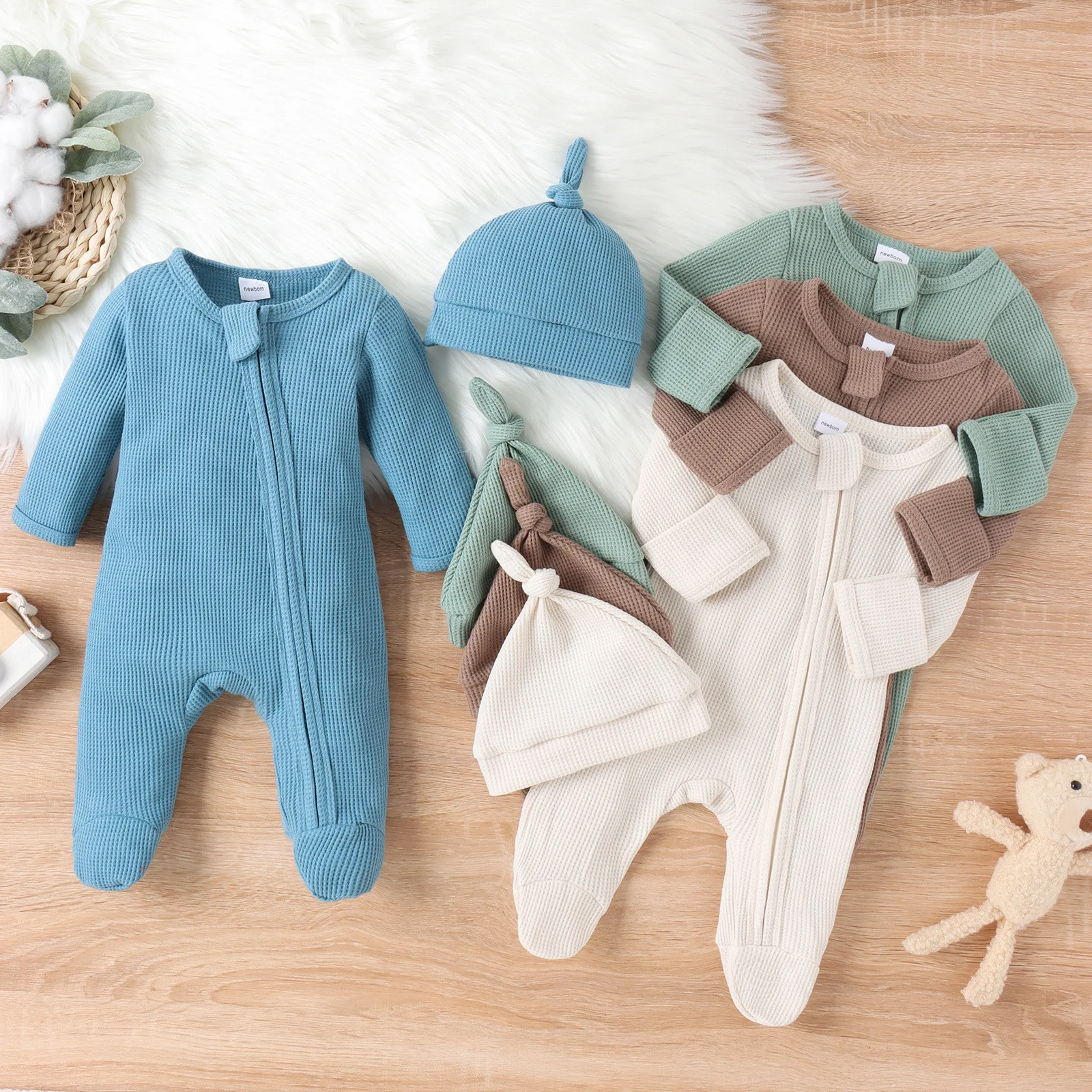 Baby Clothes Wholesale New Born Baby Gift Set Zippered Bodysuit One-Piece Waffle Romper Baby Clothing Set