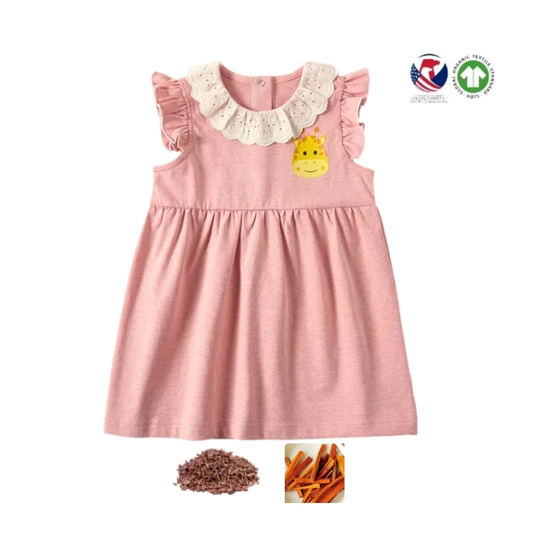 Wholesale Natural Dye Baby Girl Dress with Flying Sleeves Cute Cartoon Pattern and Ruffle Decoration Available in Pink