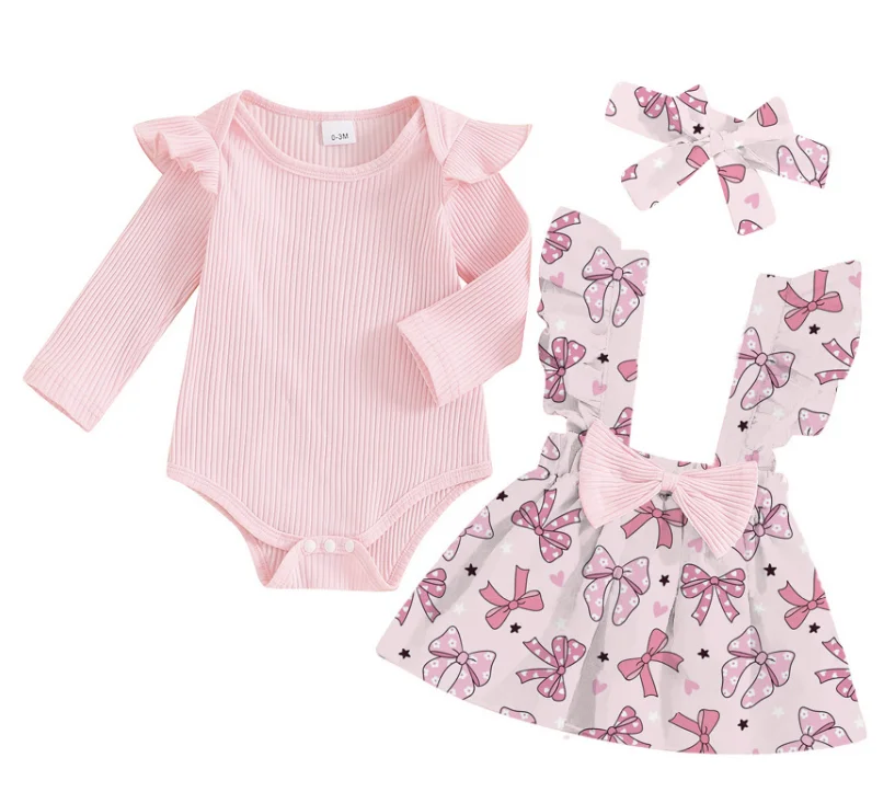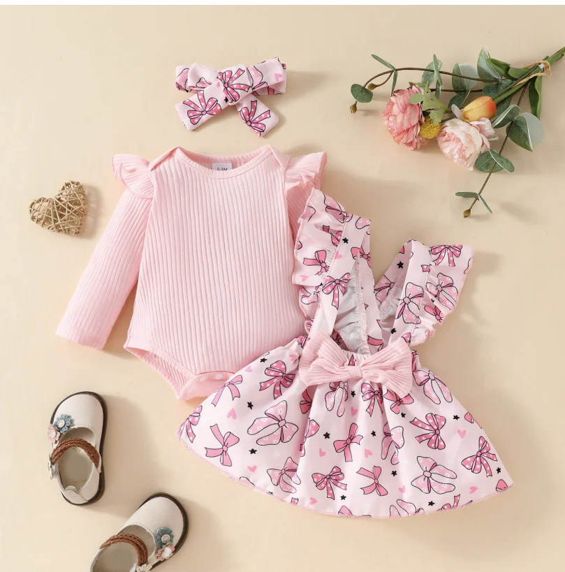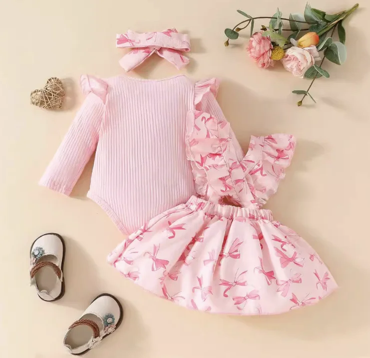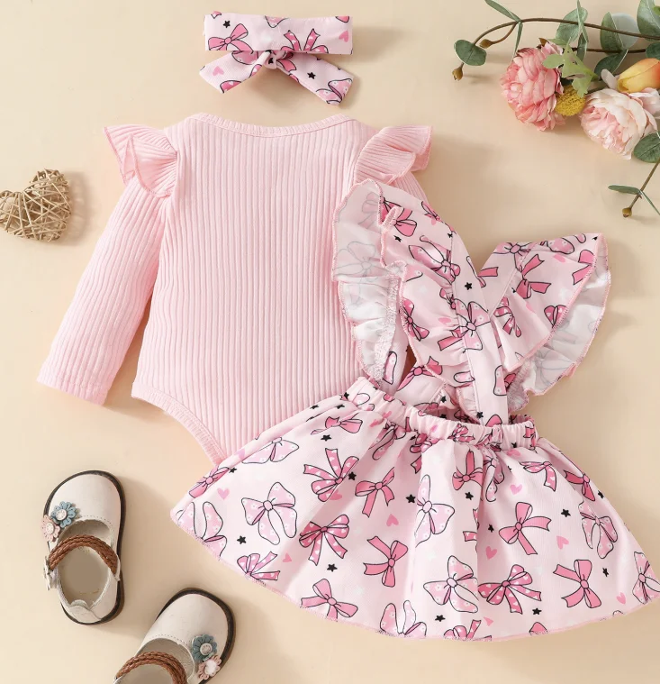 Baby Long Sleeved Ruffled Small Flying Sleeve Round Neck Bow Sweet Shoulder Strap Dress