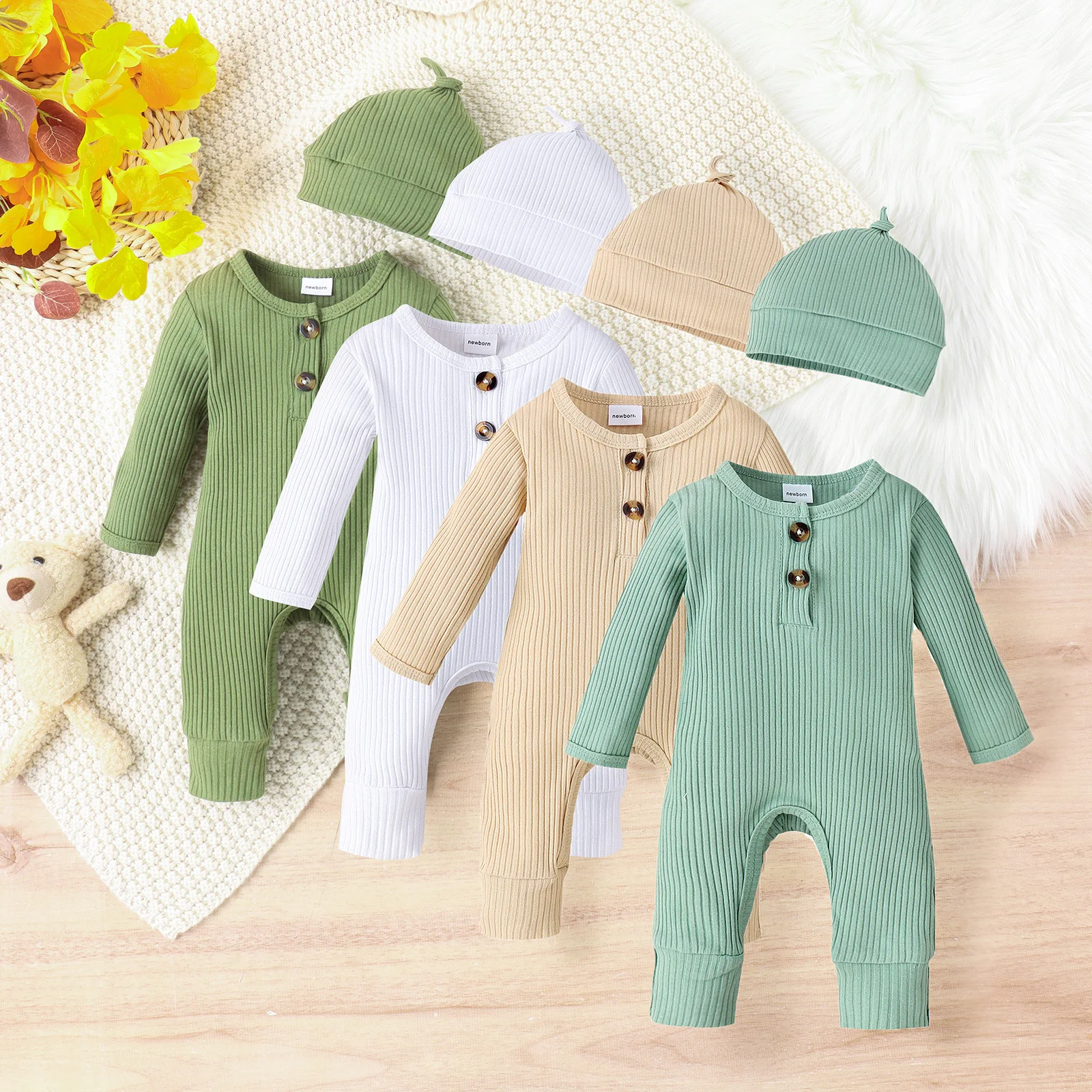 Wholesale Baby Clothing Set Open Chest Button Long Sleeve Jumpsuit Romper with Hat Fashion Style 100% Cotton for Autumn