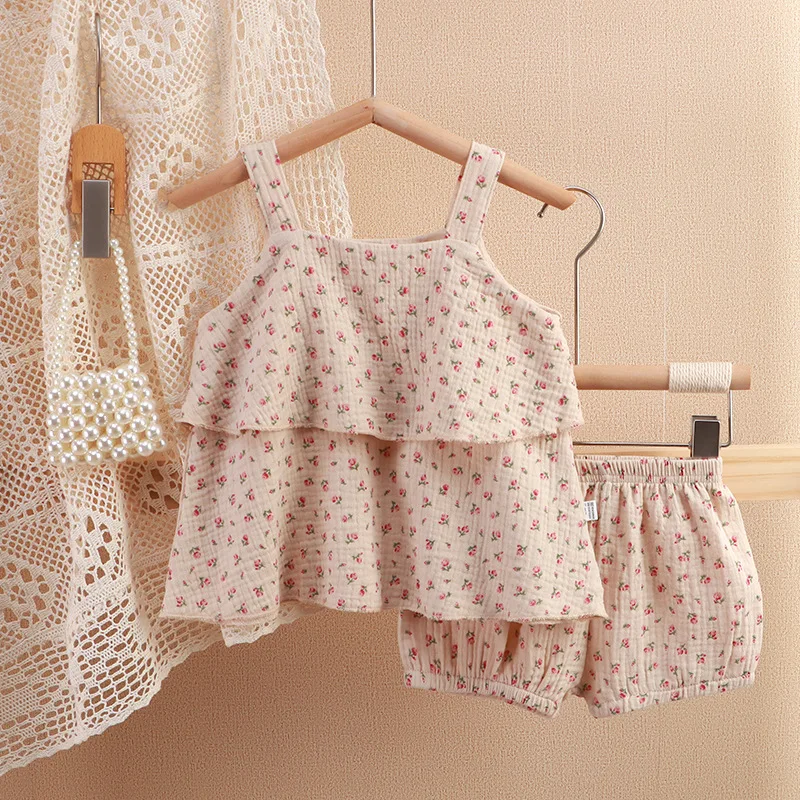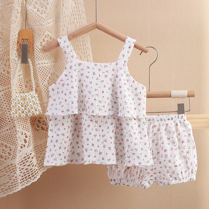 Muslin Baby Clothes Casual Two-Piece Floral Suspender Skirt Double-Layer Cotton Baby Clothing Sets