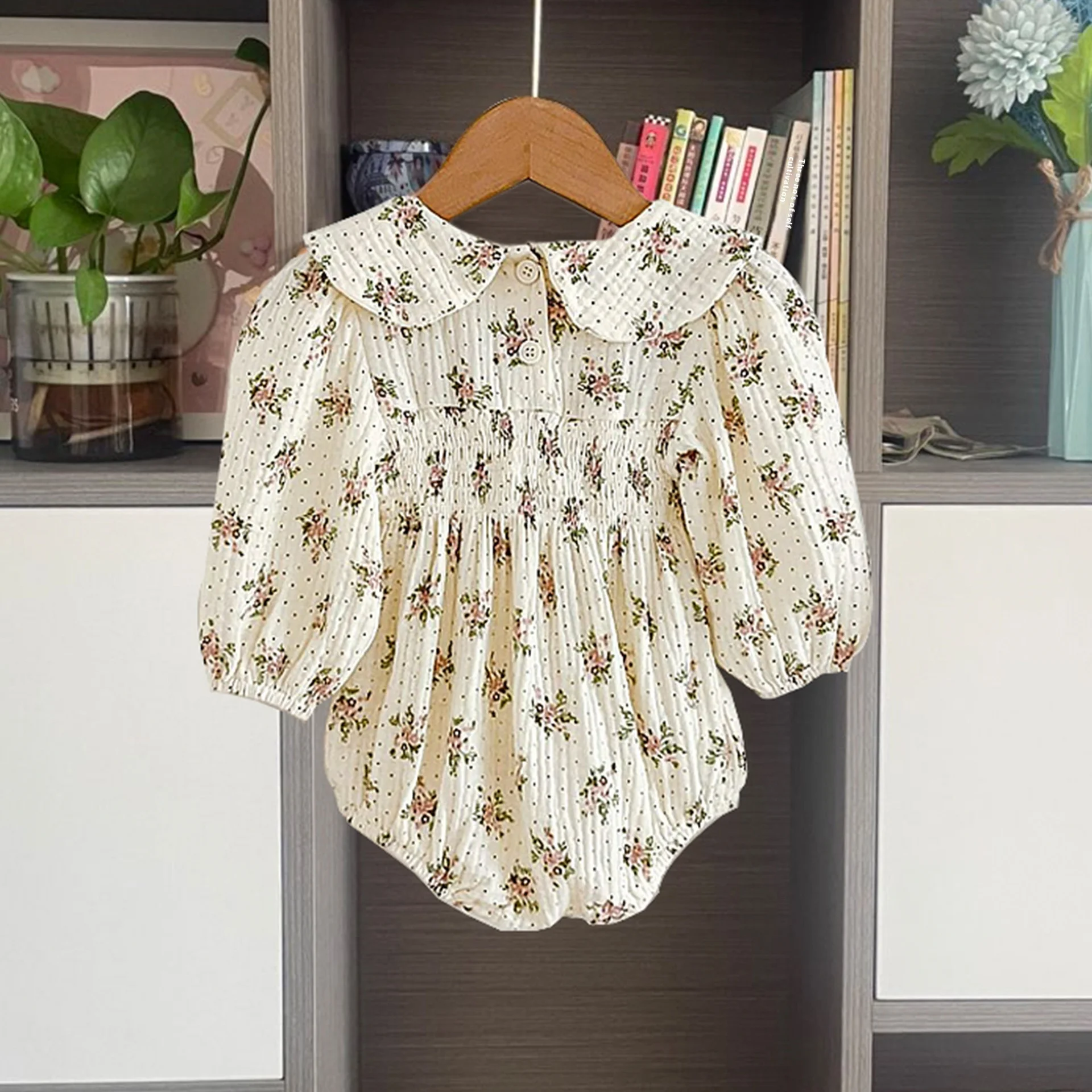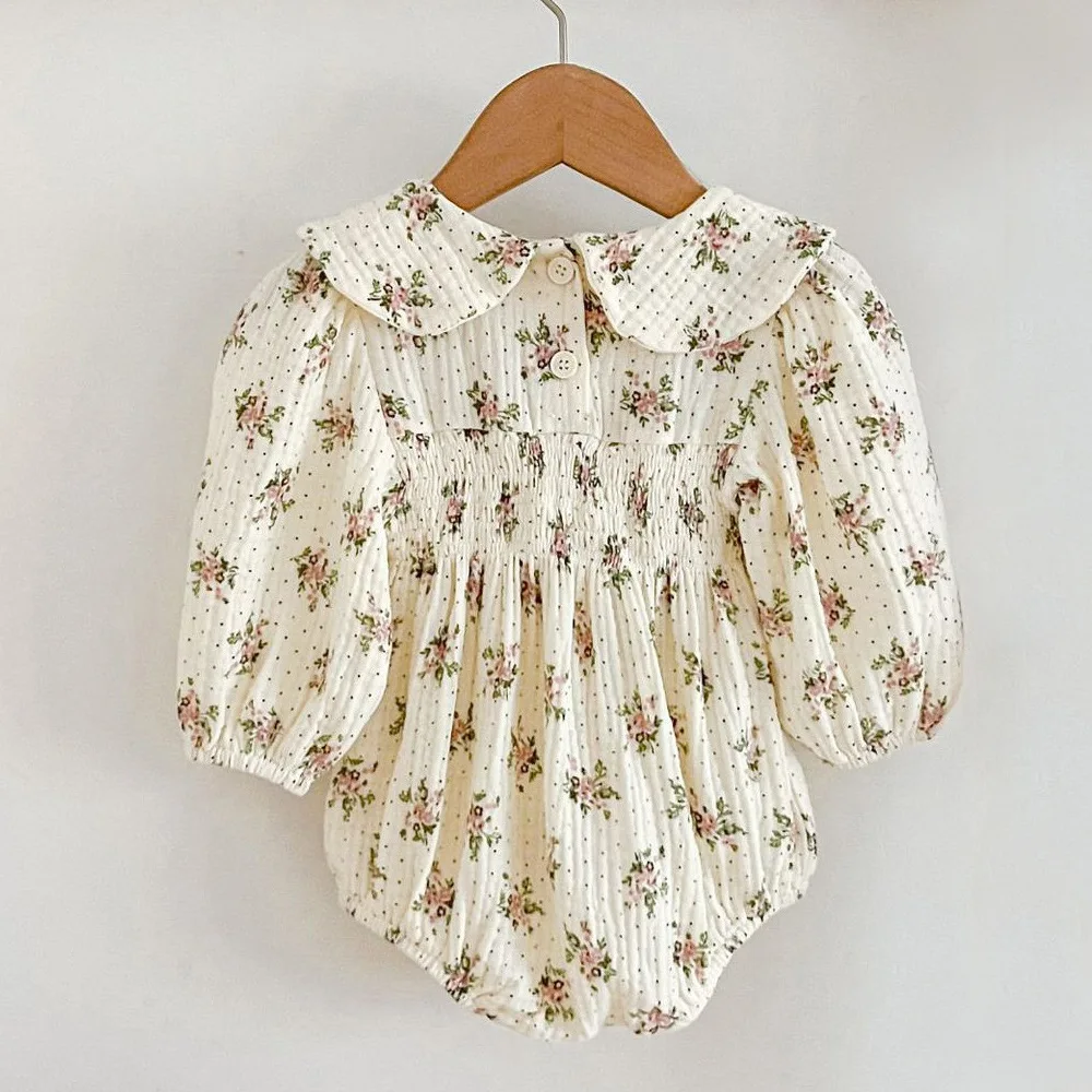 Custom Muslin Baby Clothes Shirred Smocked One-Piece Retro Printed Lotus Leaf Collar Pastoral Floral Long Sleeve Baby Rompers