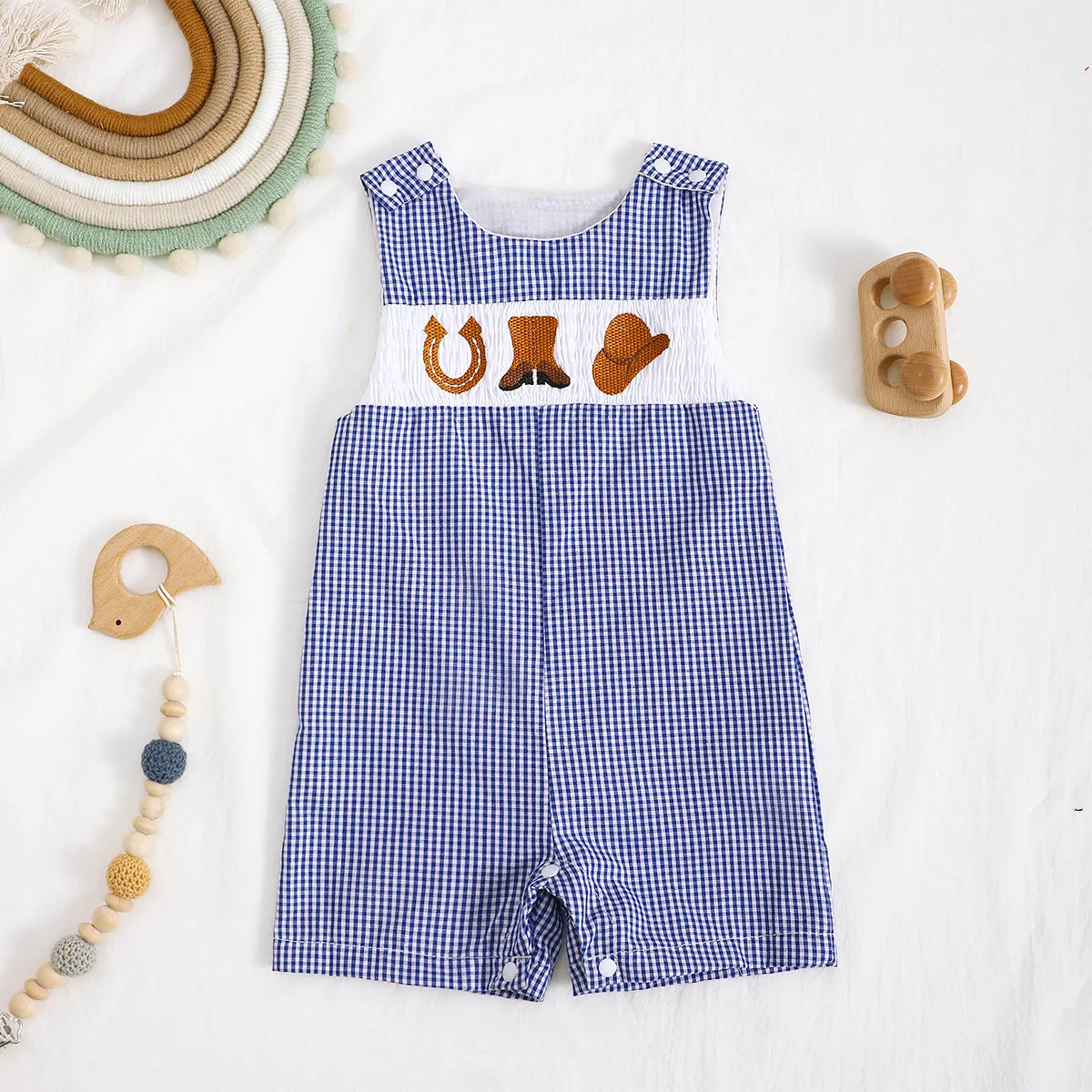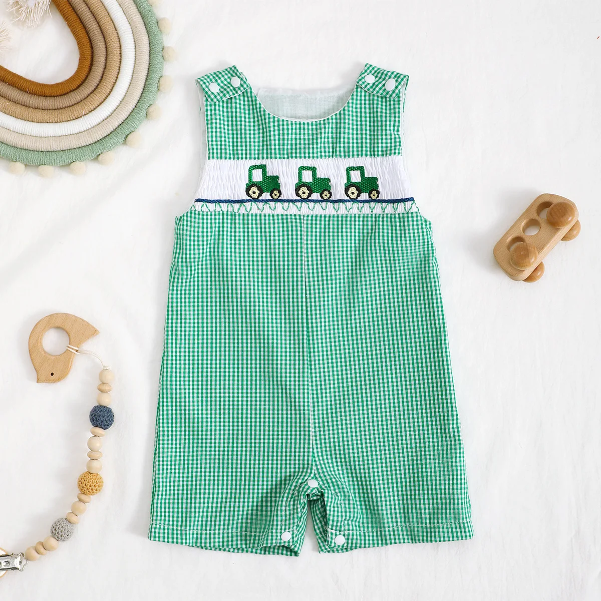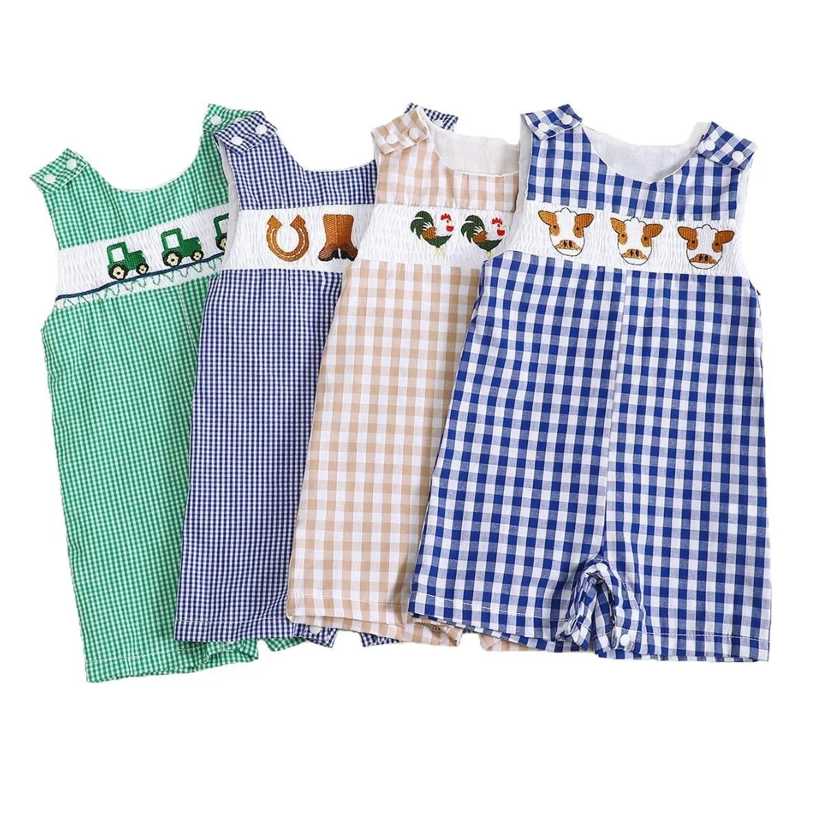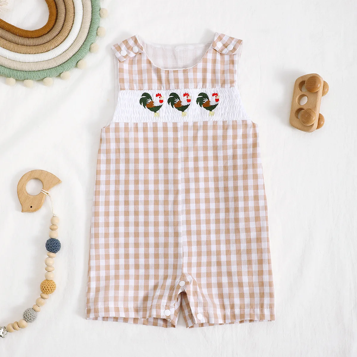 Custom Knitted 100% Cotton ODM Baby Romper Jumpsuit with Shirred Smocked Embroidered Plaid Design