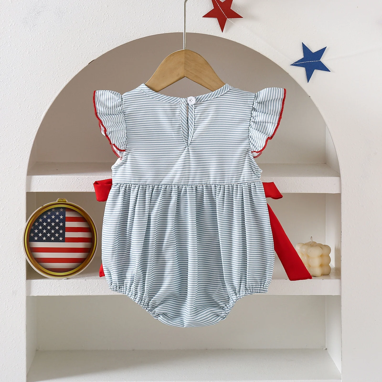 Custom Baby Clothes Shirred Smocked Baby Clothing July 4th Embroidery Bowknot Baby Rompers