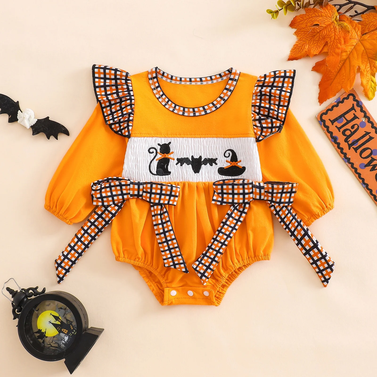Autumn New Plaid Long Sleeve Bowknot Shirred Smocked Baby Clothing Jumpsuit Baby Rompers