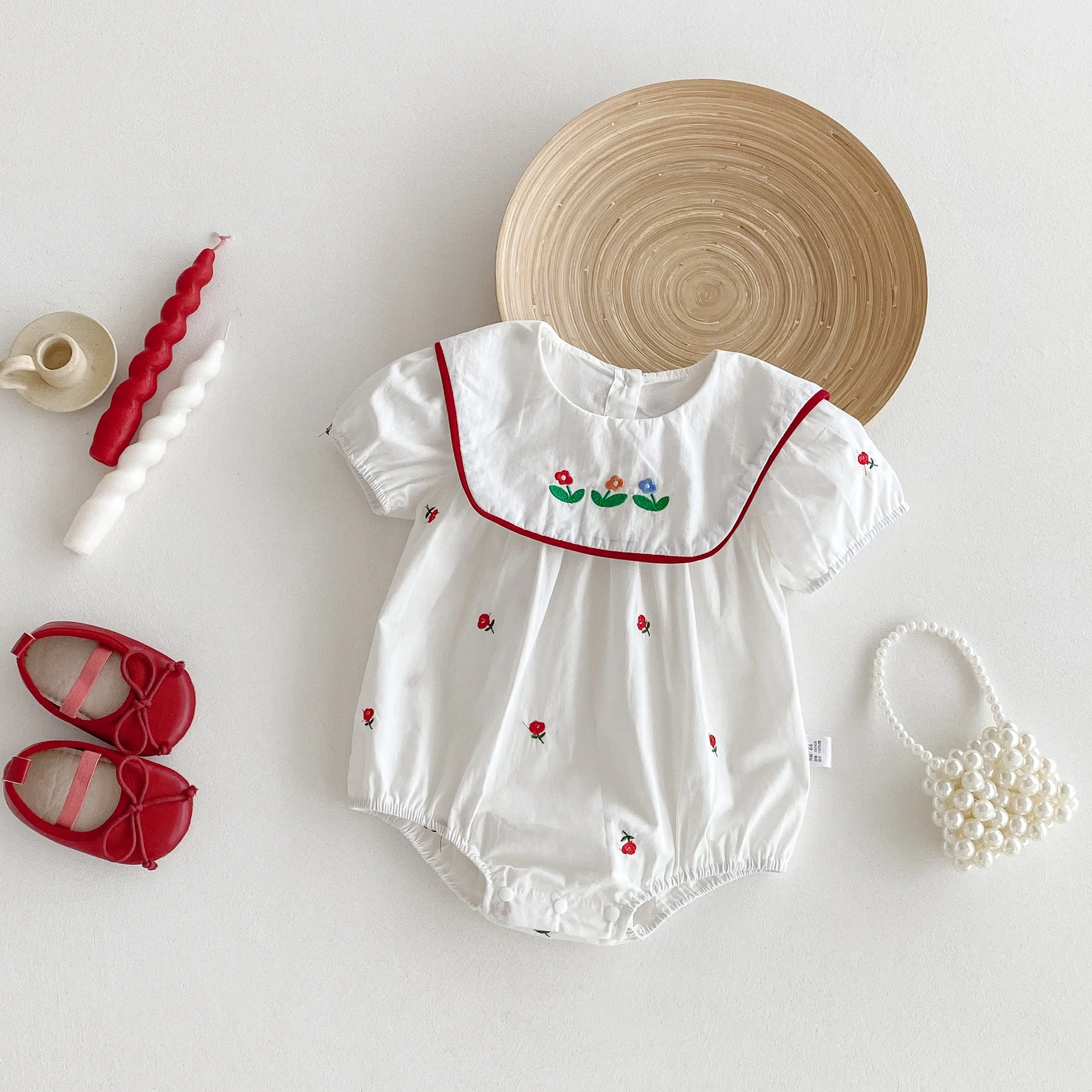 Summer Collection 100% Cotton Baby Girl Rompers with Floral Embroidery Square Neck & Short Sleeves ODM Supply