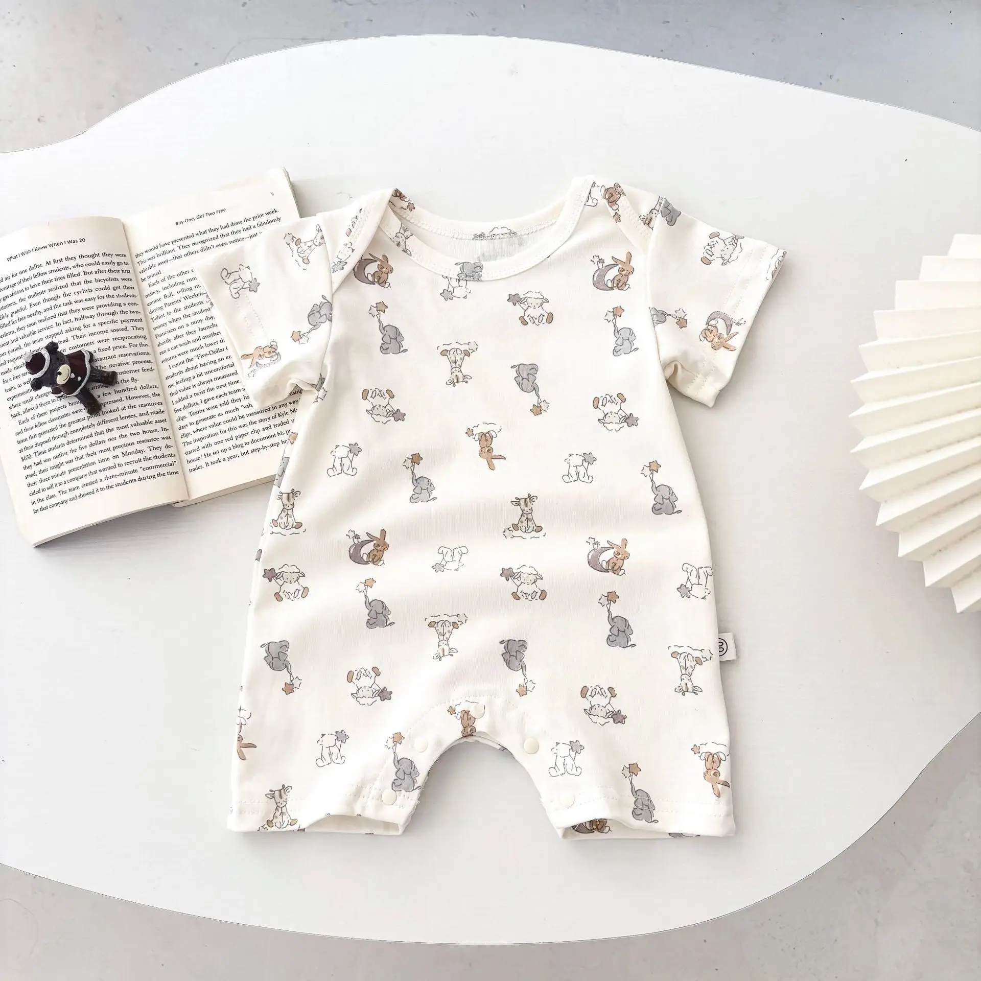 Unisex Summer Outfit 100% Cotton Nordic Style Short Sleeve Casual INS Inspired Rompers Cartoon Print Knitted Crawling Suit for