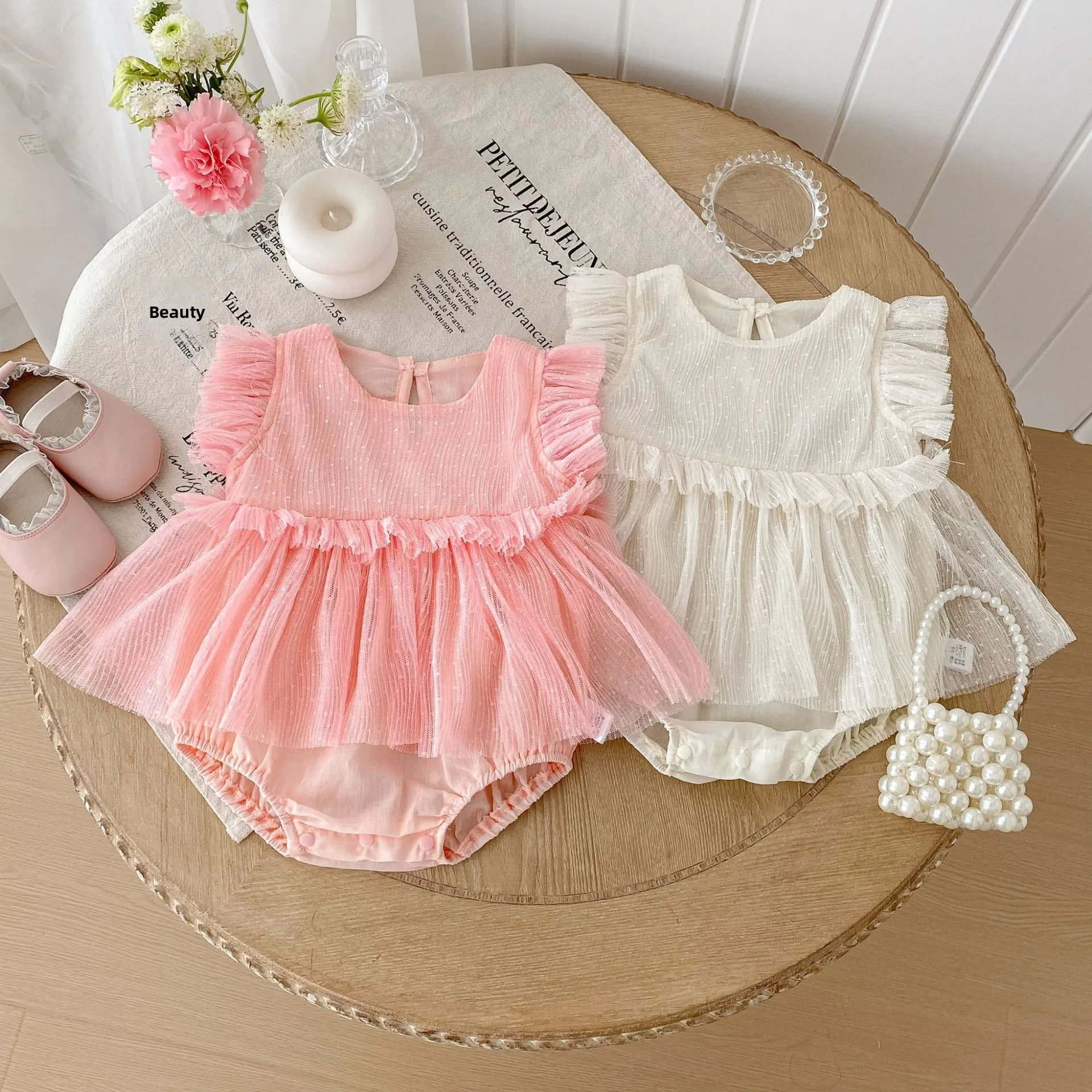 Summer Casual Baby Girl Dress Flying Sleeve Round O-Neck Lace with Mesh Baby Dress