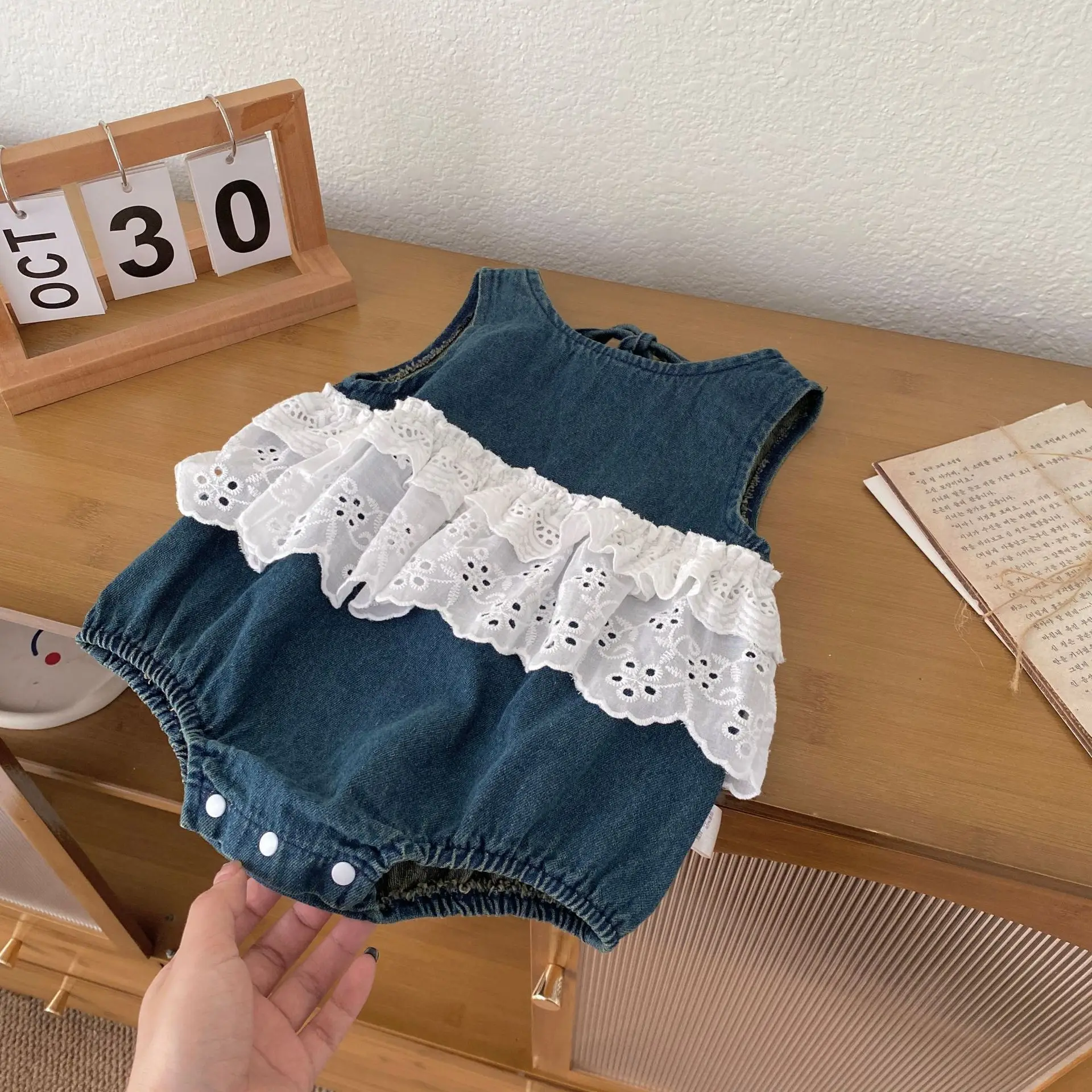 Summer Casual Style Infant Toddler Girl Outfit Sweet Sleeveless Patchwork Denim Lace Solid Baby Rompers