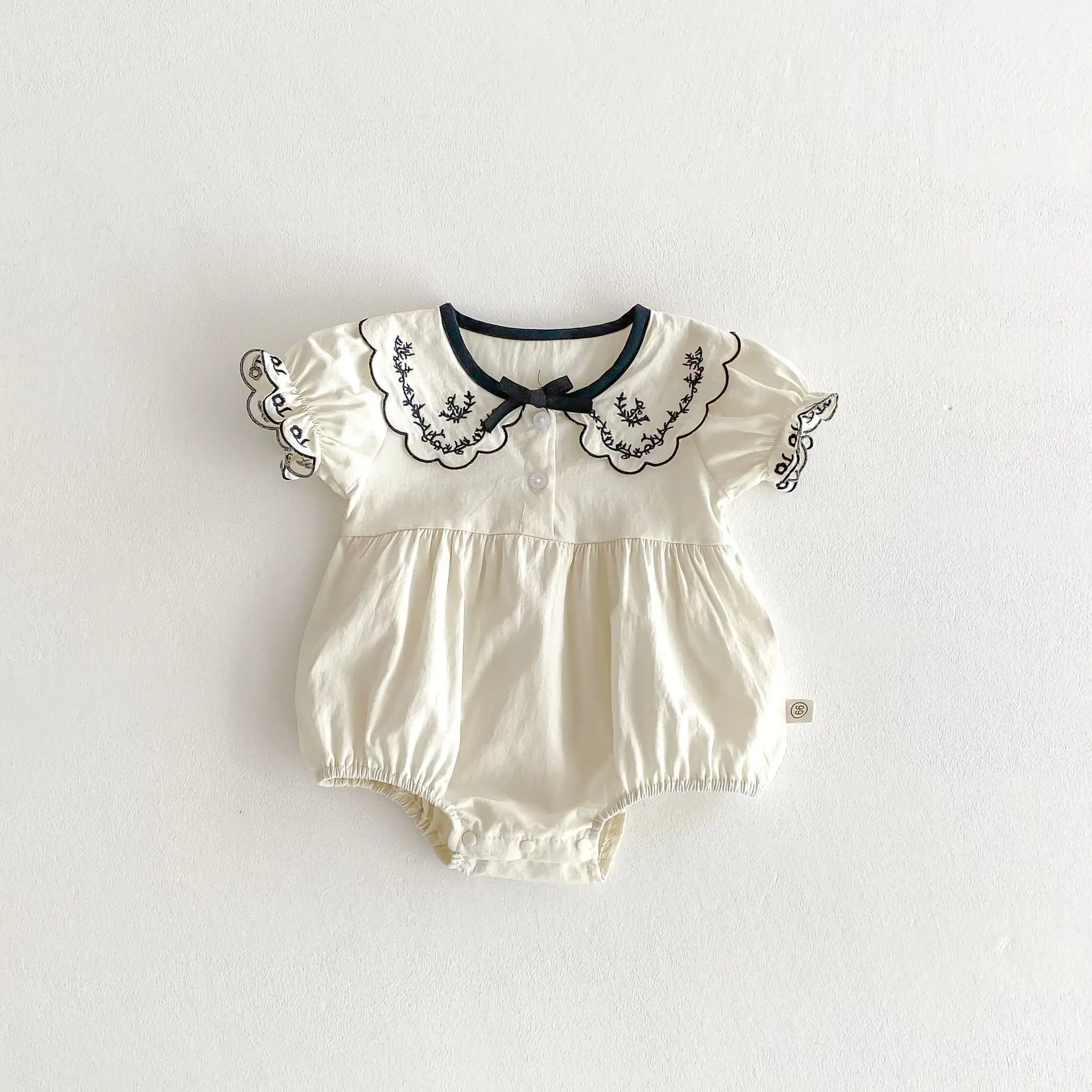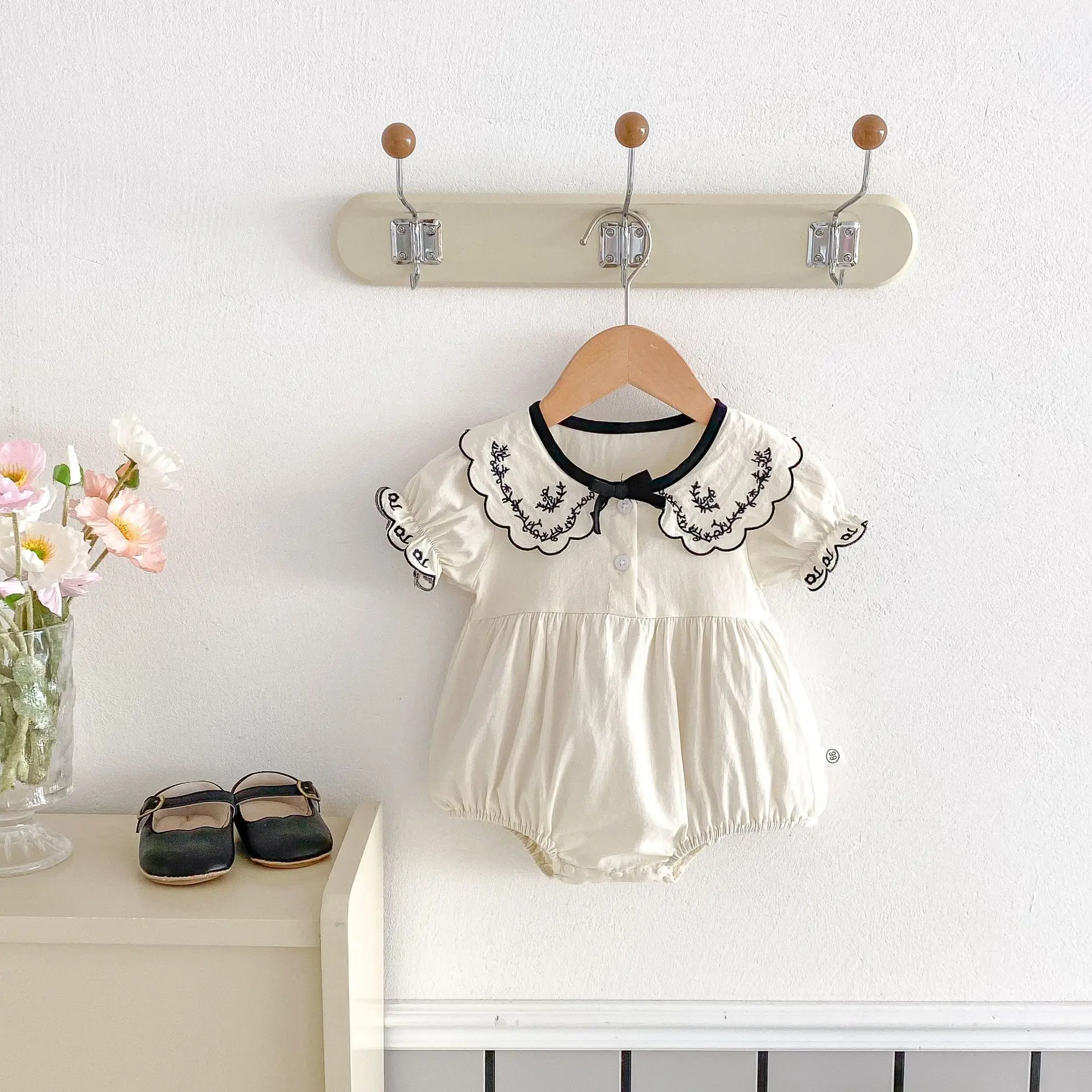 Casual Floral Embroidered Turn-Down Collar Short Sleeve Sweet Bow Button Baby Girl Rompers