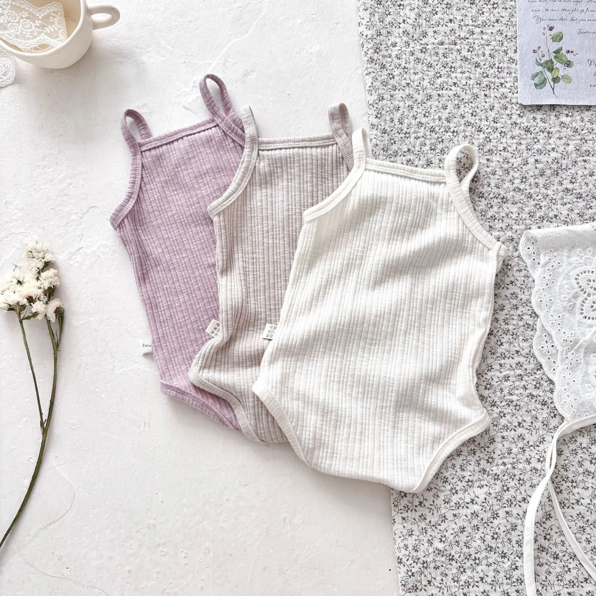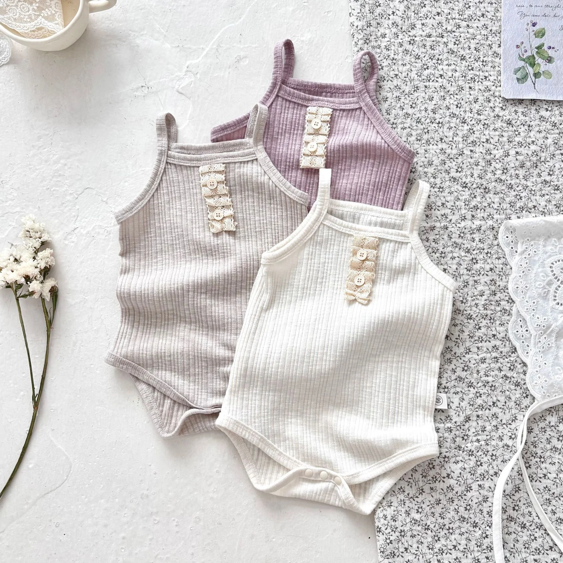 Summer Infant Romper Baby Girls Casual Solid Ribbed Lace Double Button Strap Simple Baby Jumpsuits