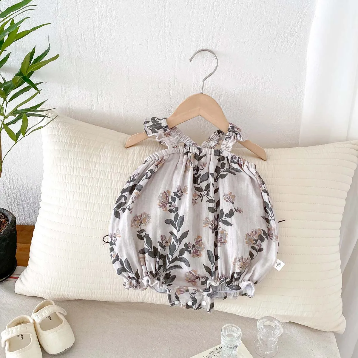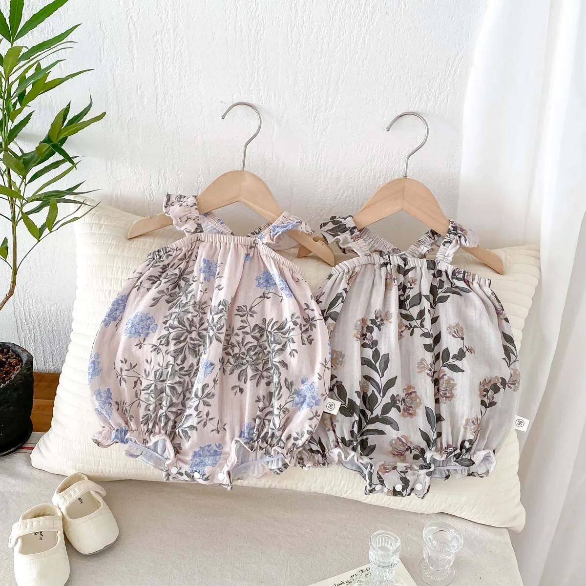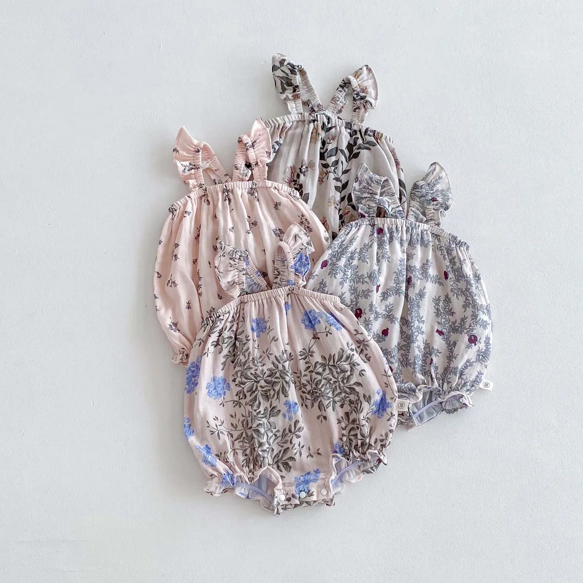 Summer Floral Pattern Flutter Sleeve Strap Casual Breathable Gauze Button Thin Jumpsuit Crawling Outfit Baby Girl Rompers