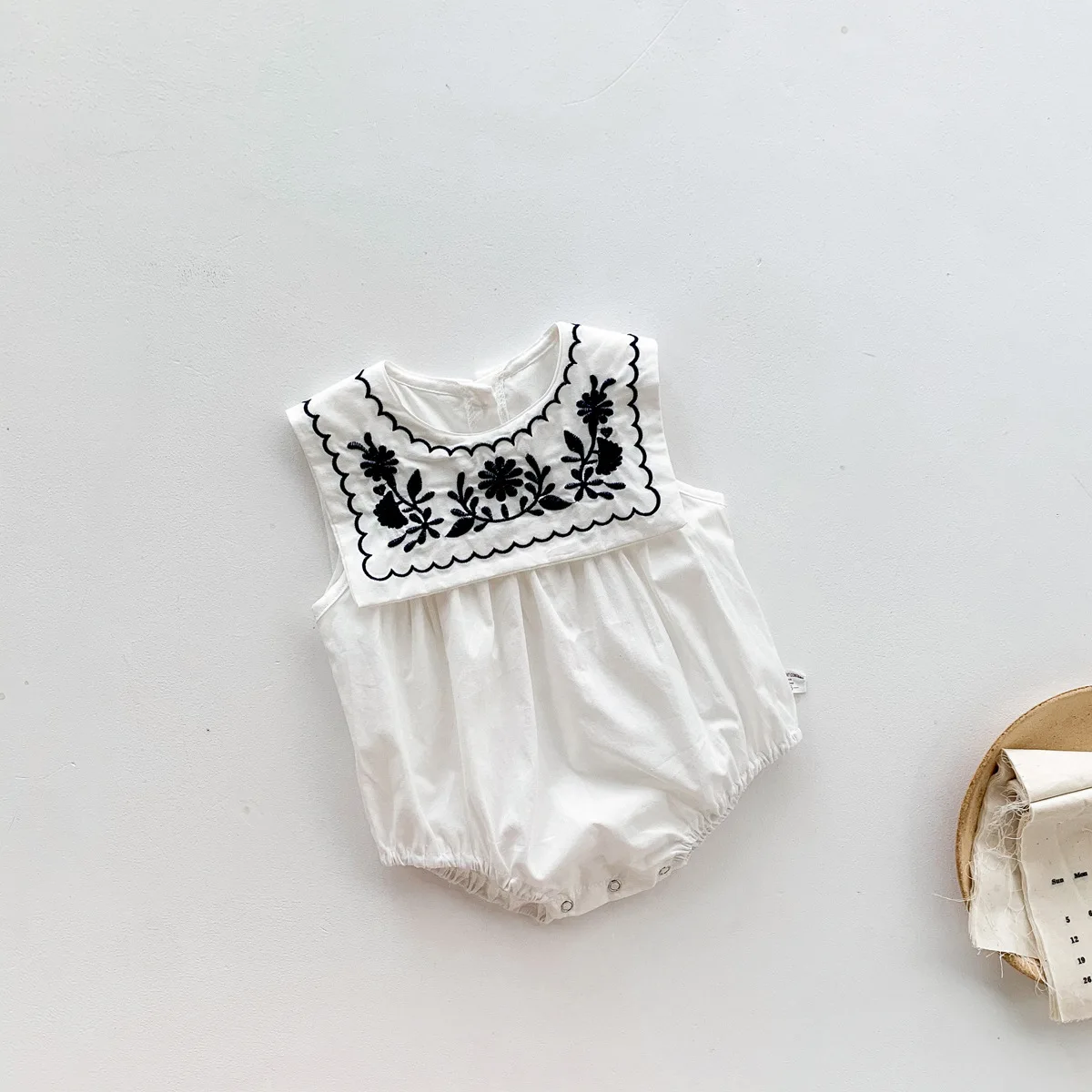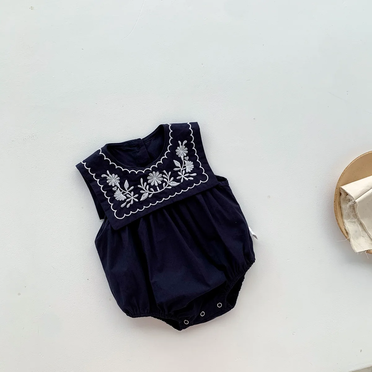 Summer Infant Girl Baby Coveralls Rompers ODM Button Closure Cool Navy Solid Pattern Jumpsuit Embroidered Collar Casual