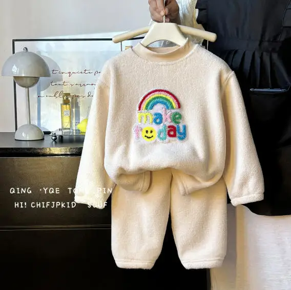 Children's Home Clothes Cardigan Baby Girl Pajamas Set New Furry Soft Waxy Jacquard Loose Flannel Set