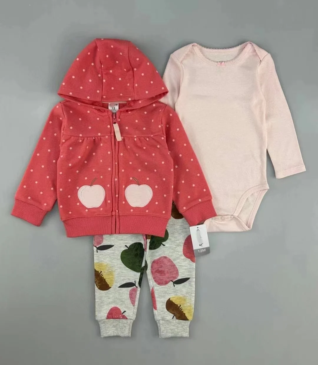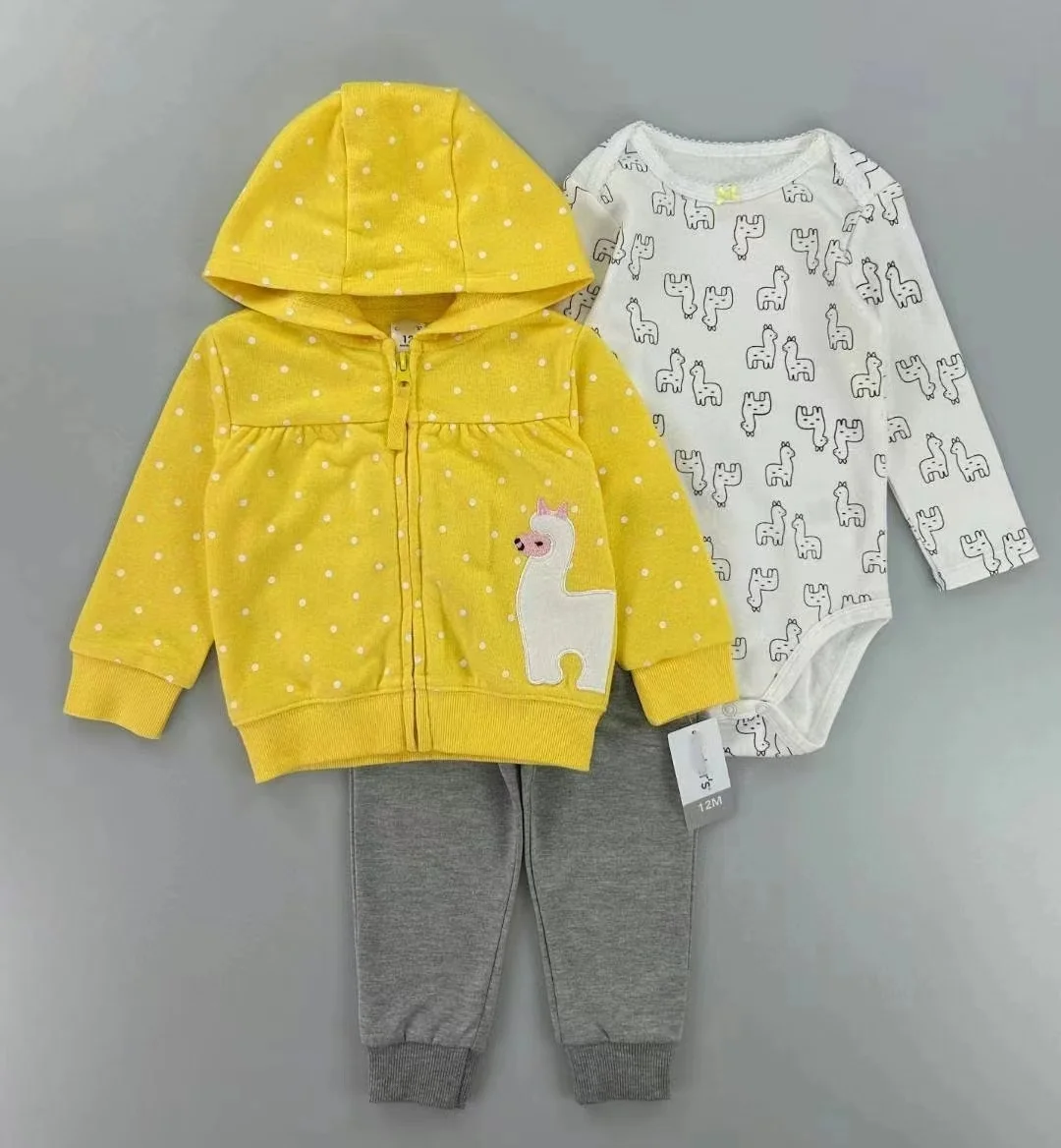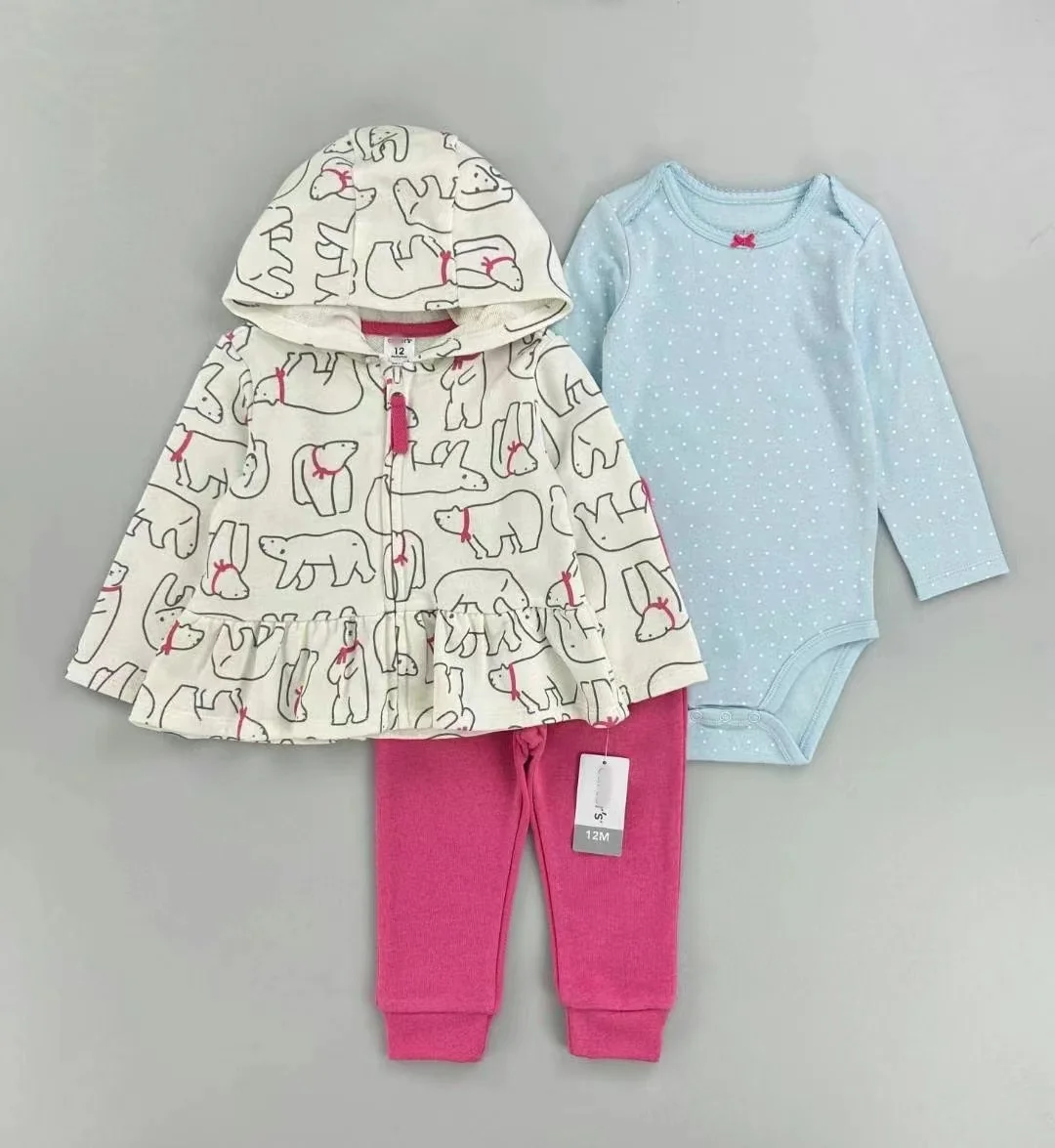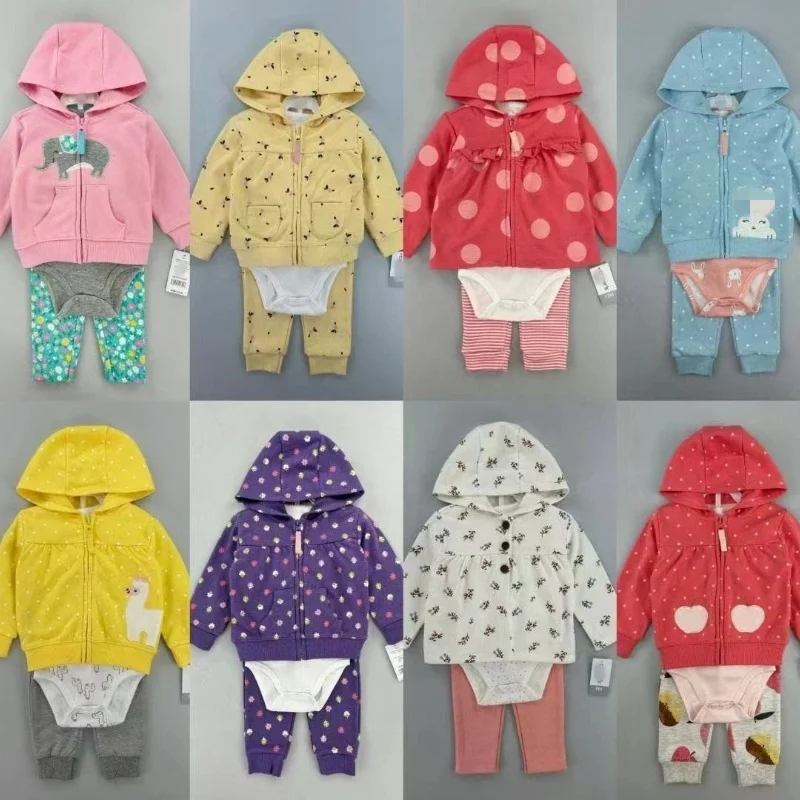 Summer Hot Sell Newborn Hooded Coat Onesies and Long Pants Three Piece Baby Zipper Cotton Soft Sets Newborn Cute Cartoon Sets