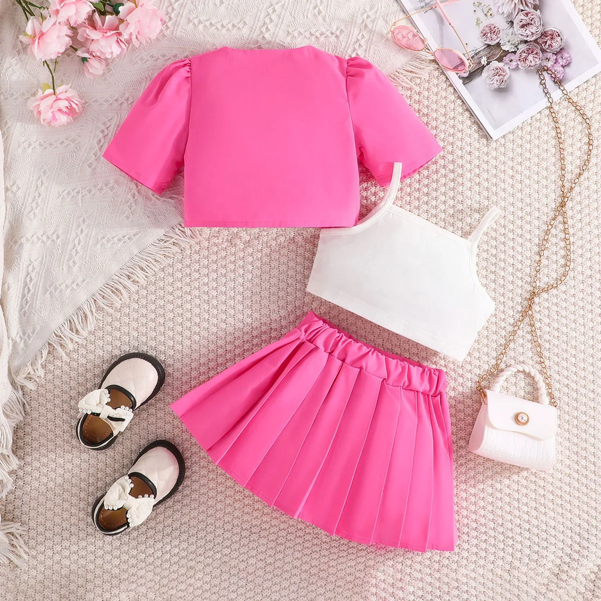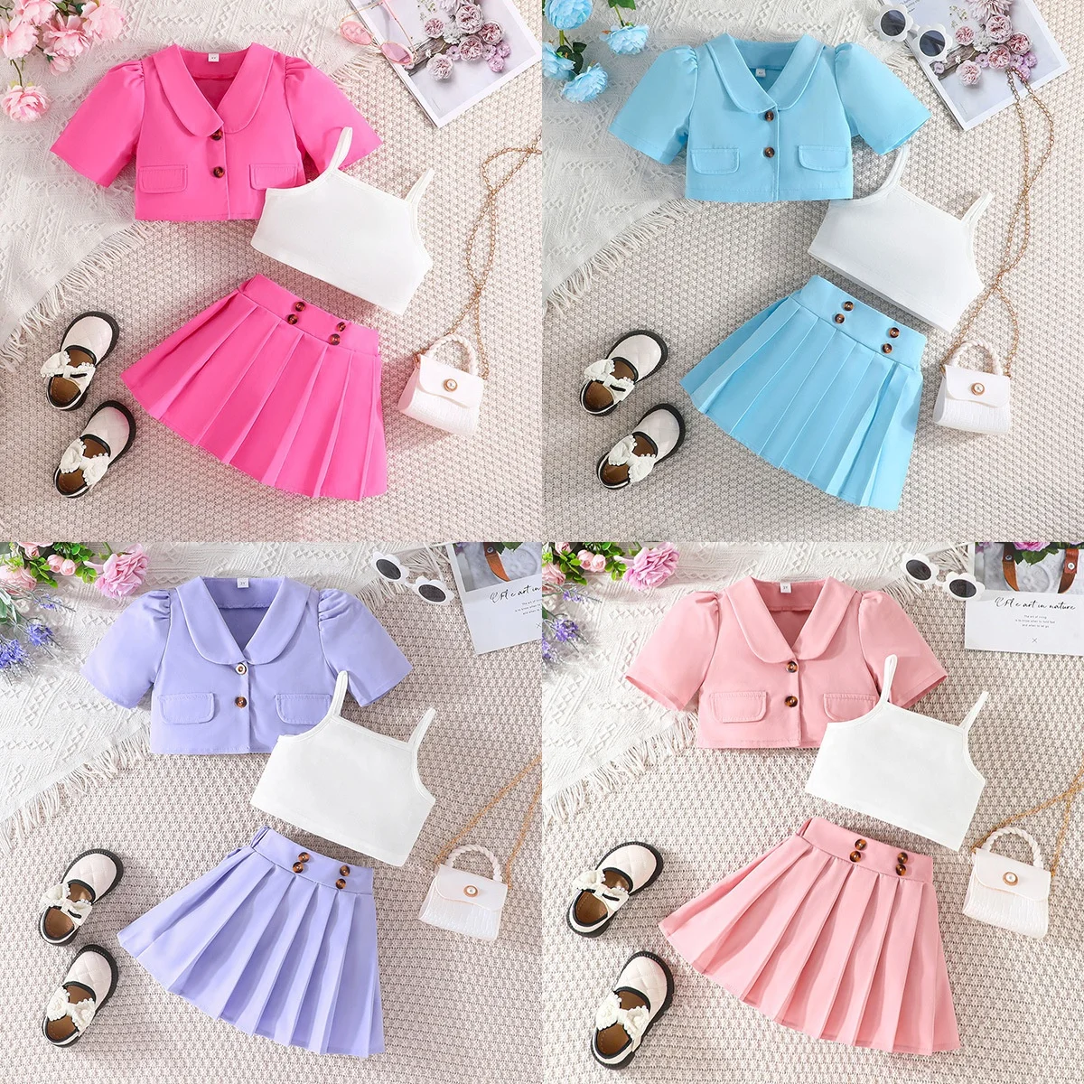 2026 Summer Woolen Kids Clothing Set Hot Selling Casual Girls Blazer Coat Pleated Vest Solid Color Short Sleeve Skirt 3pcs Girls