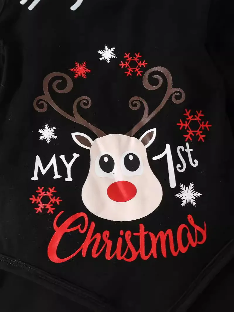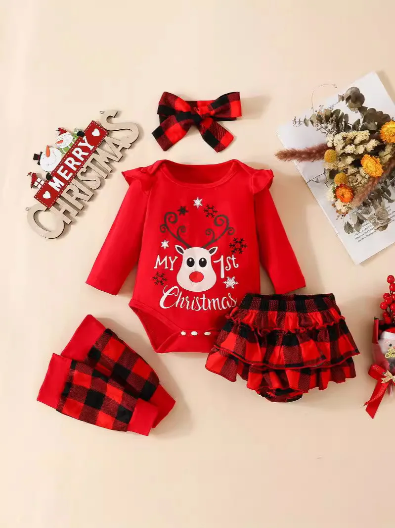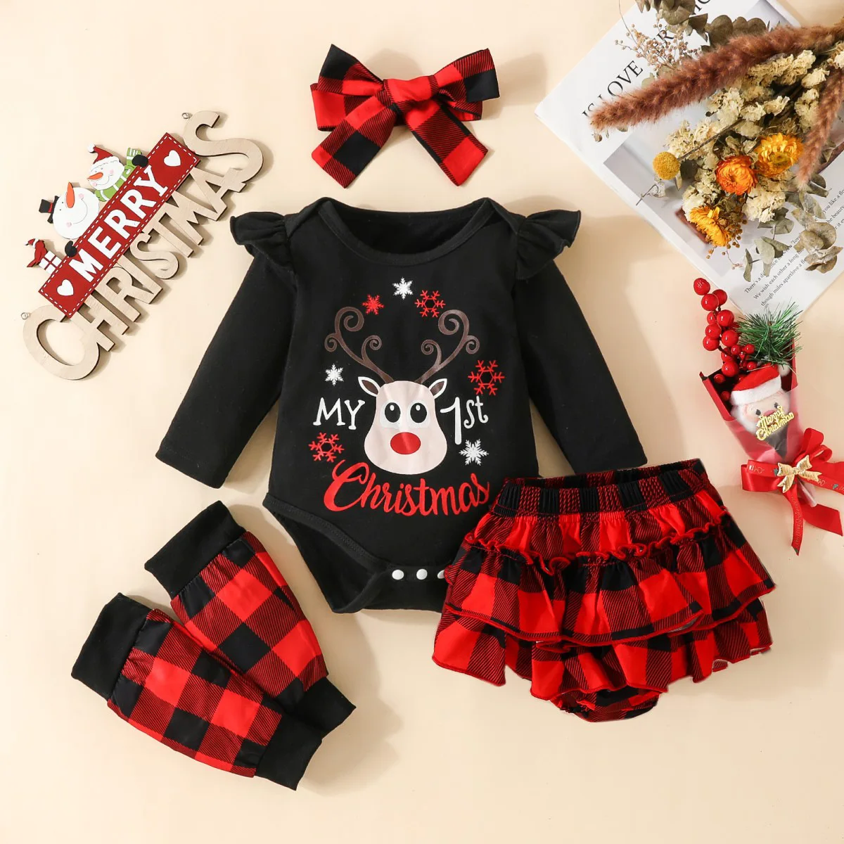 European American Baby Christmas Four-piece Long Sleeve Letter Deer Head Triangle Plaid Shorts Pants Cover Turban