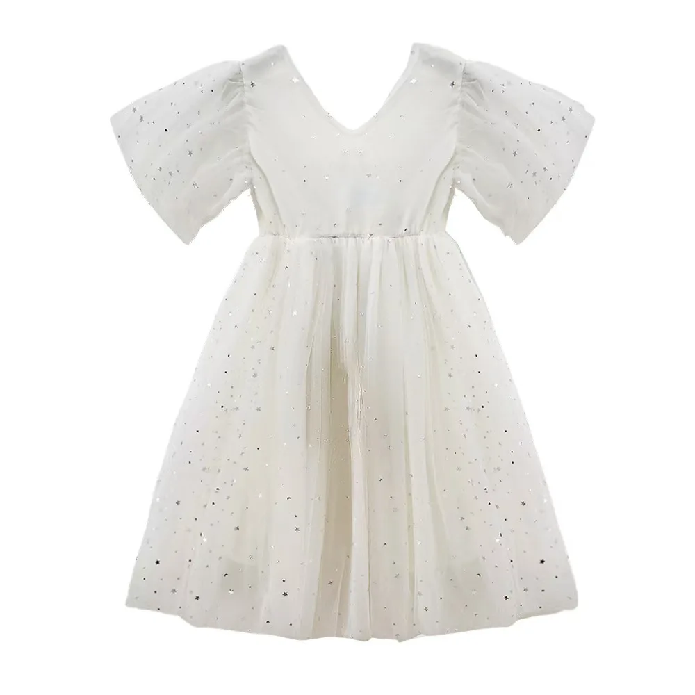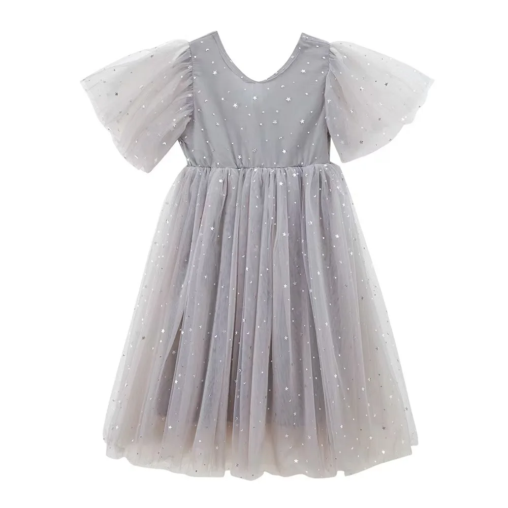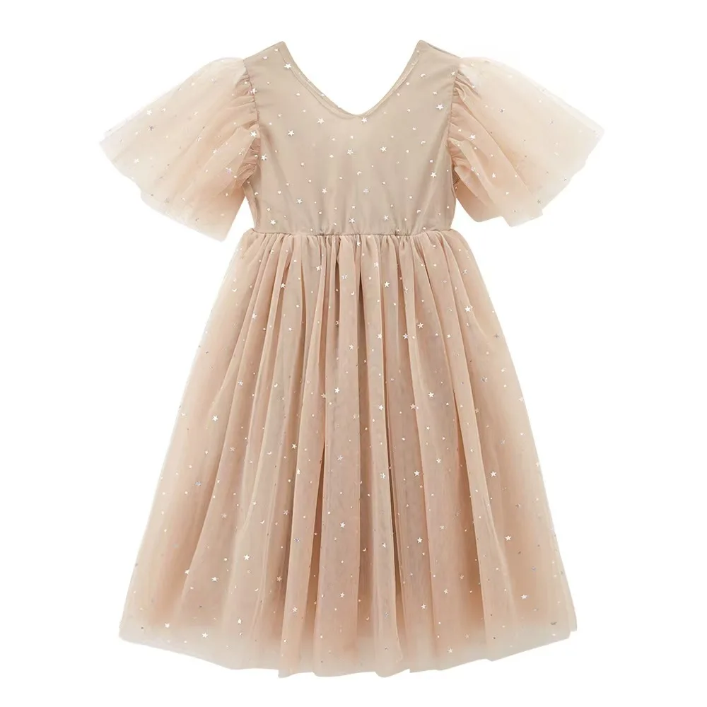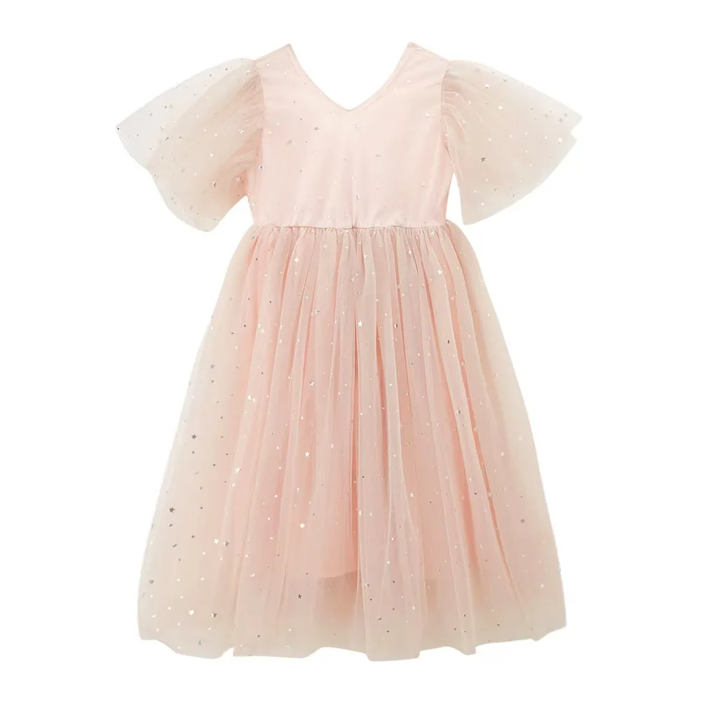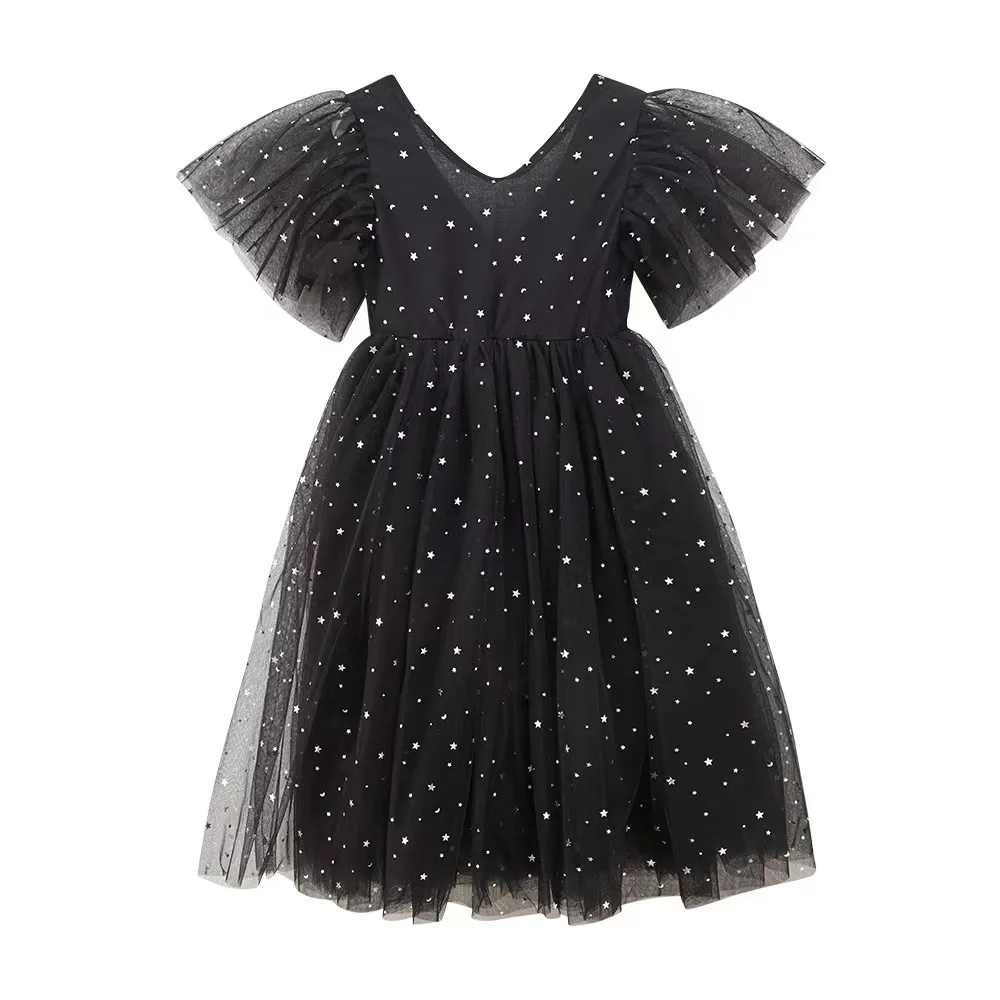 Summer Children Girls' Princess Dress O-Neck Fly Sleeve Evening Birthday Sequined Lace Sweet Style Print Pattern