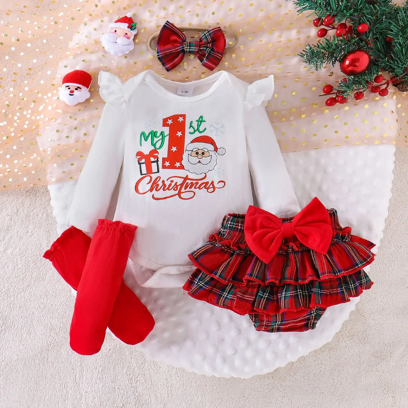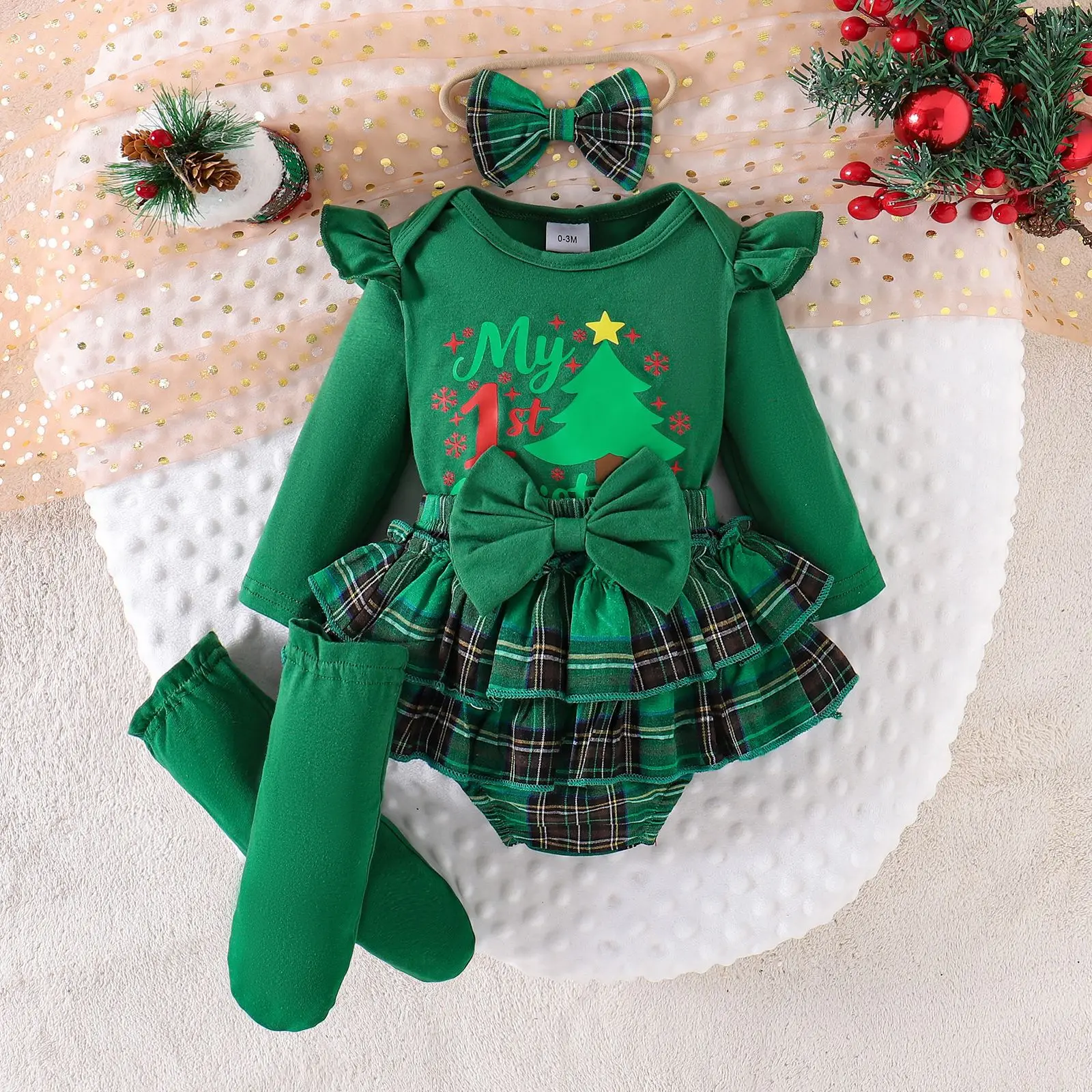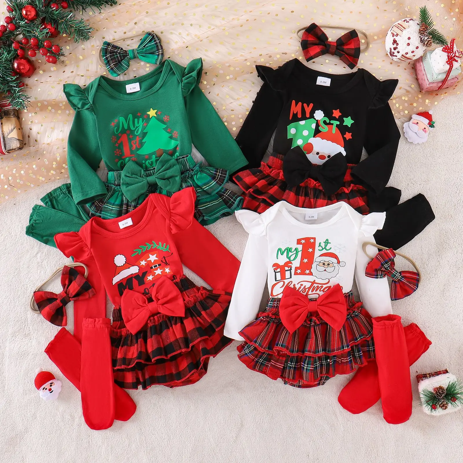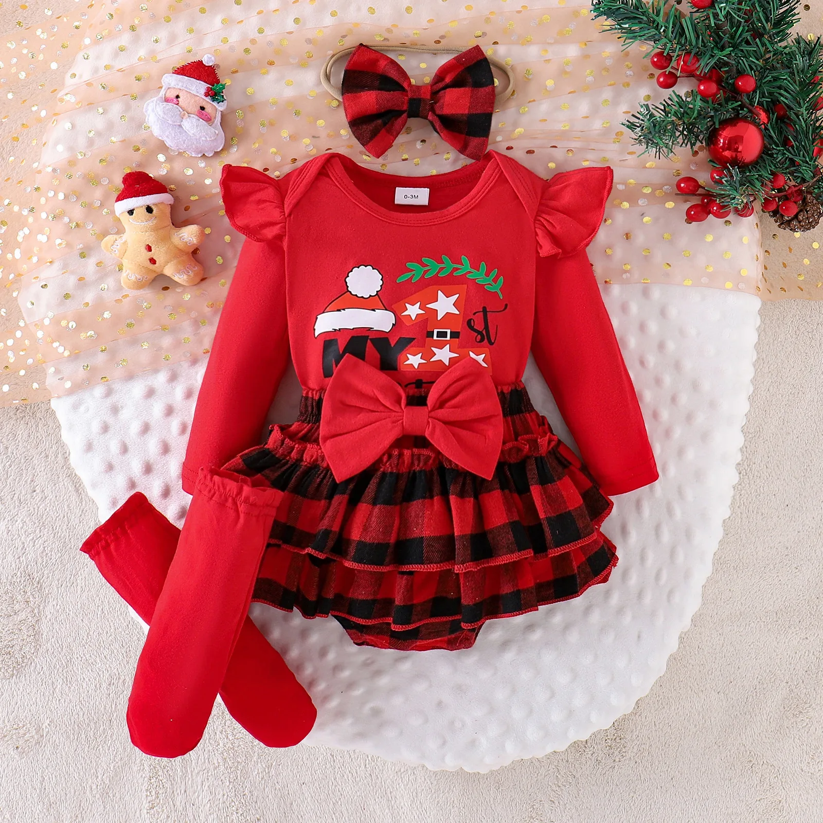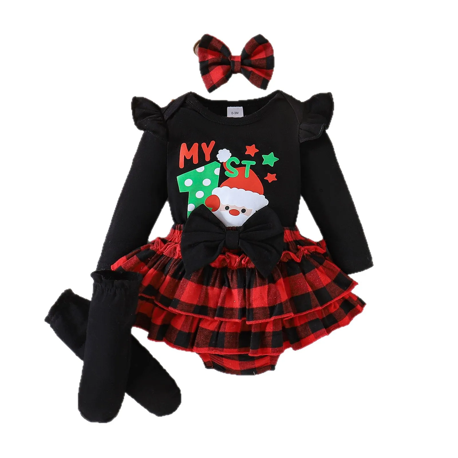 For 25-Year Cross-Border European and American Baby Cotton Flying Sleeve Top Plaid Skirt Socks Christmas Suit