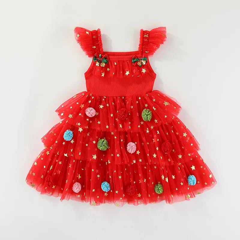 European and American Christmas Holiday Dress for Girls Crocheted Mesh Flower Design Nylon Soft Treatment Dress