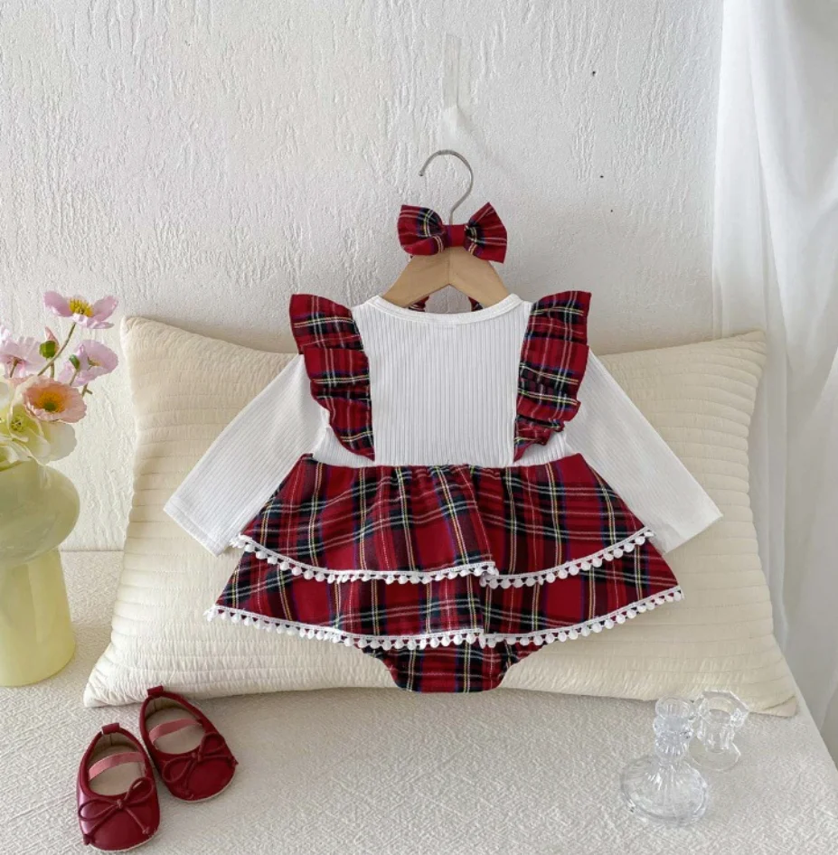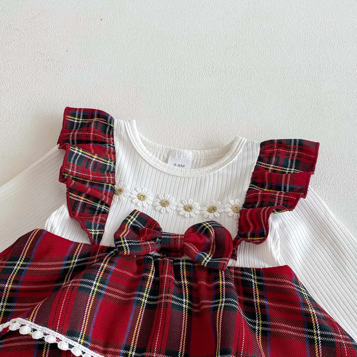 Cross-border Girls' Long-sleeved Crocheted Autumn Winter Children's Christmas Plaid Two-piece Strap Bag One-piece Dress