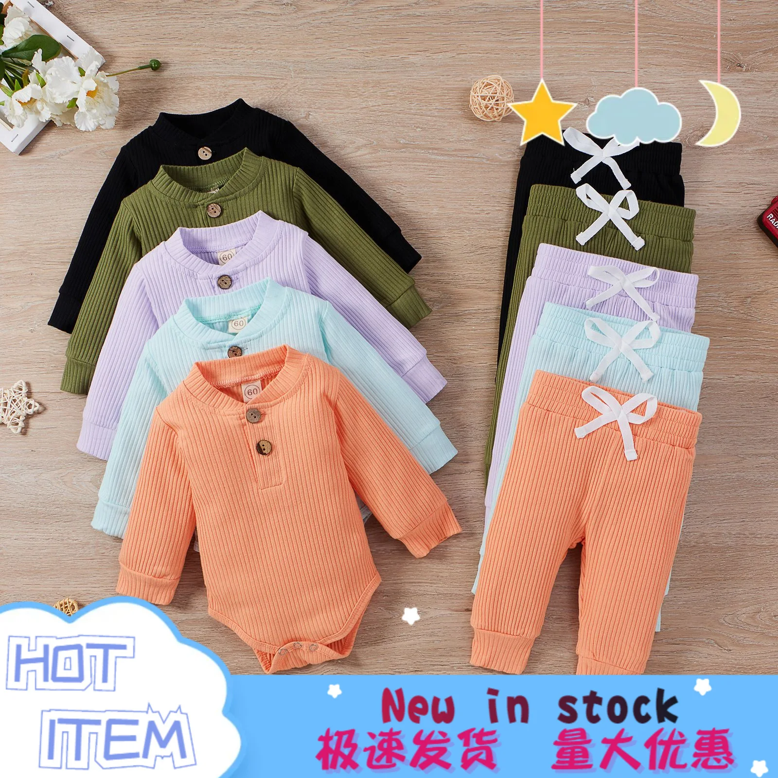 Newborn Baby Boy and Girl Clothing Hooded Long Sleeved Jumpsuit, Solid Color Ribbed Baby Autumn and Winter Clothing Set
