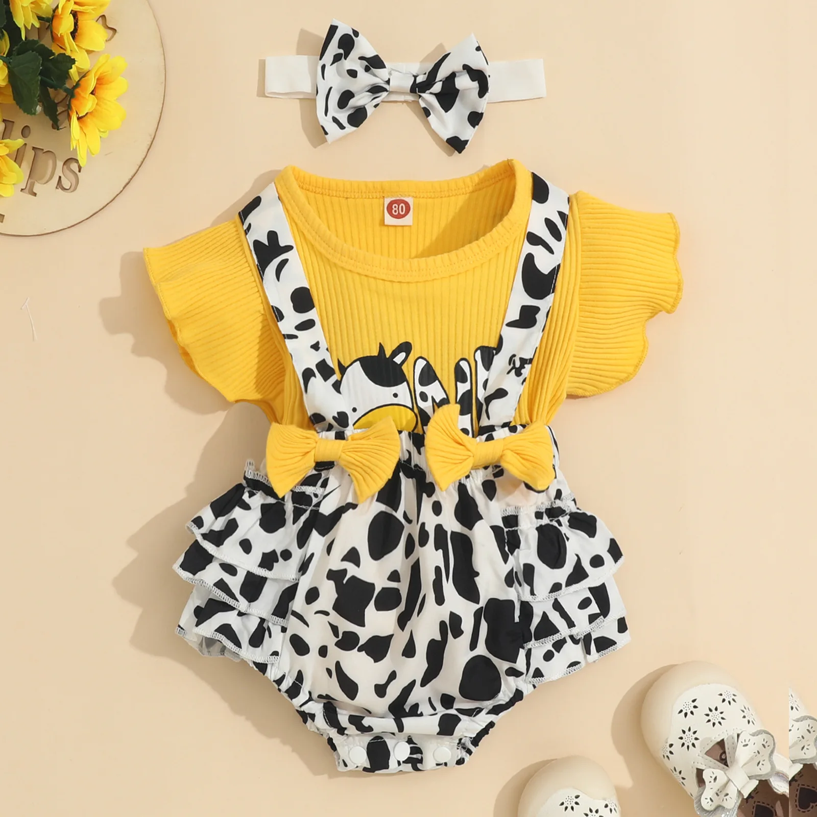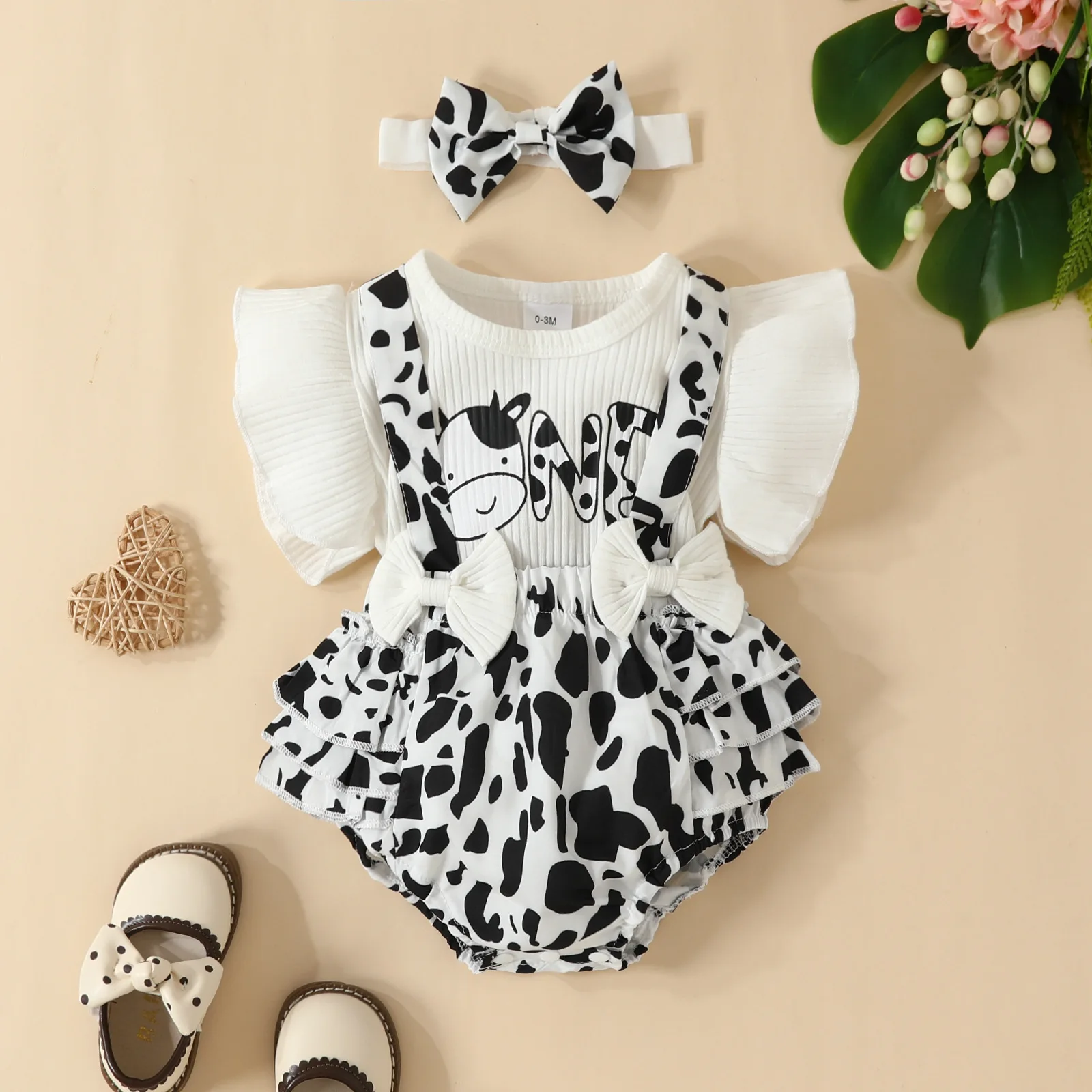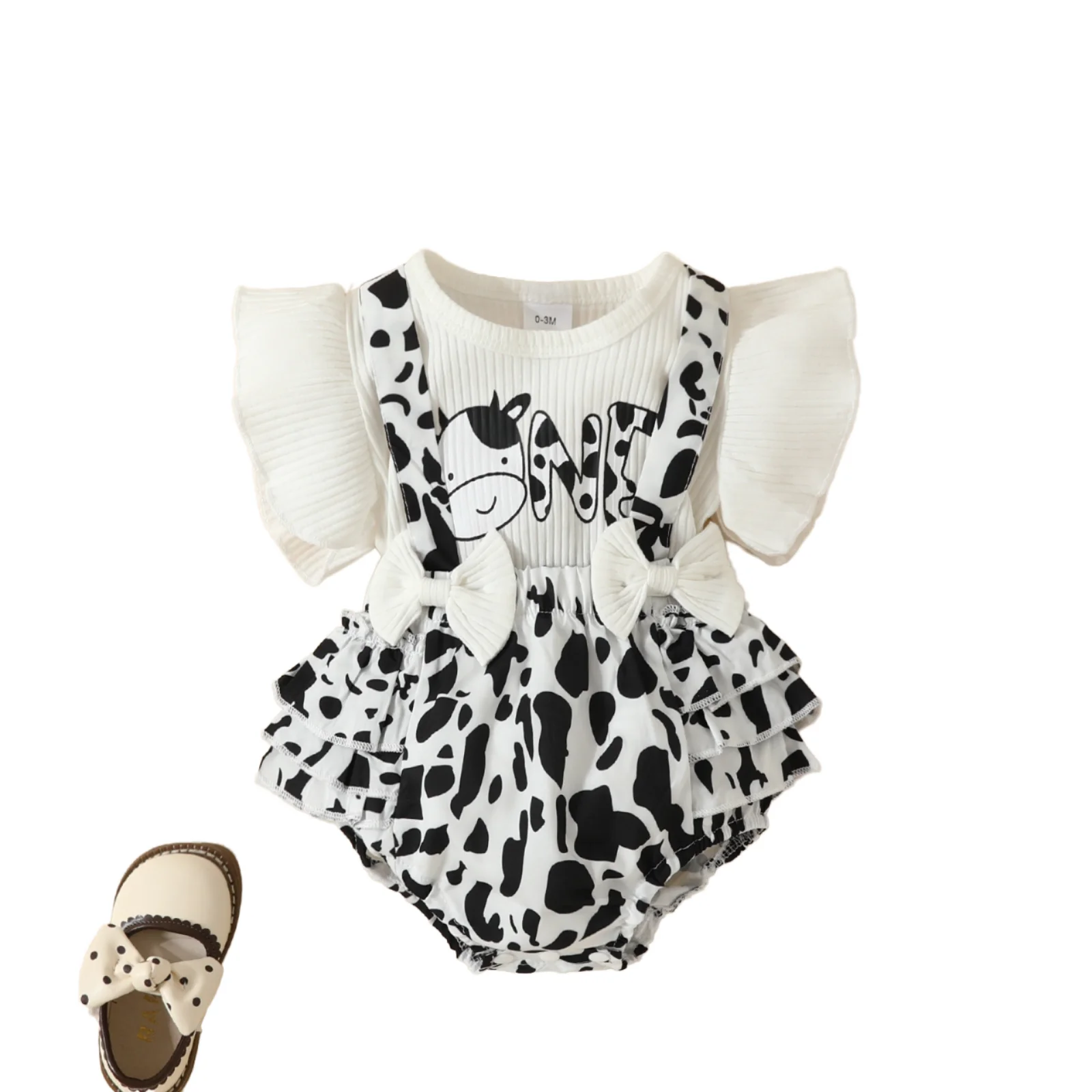 Summer Ribbed Infant for Onesies 3pcs Set Cute Cow Print Baby Romper with Ruffle Edge Fashionable Cotton Clothes Wholesale