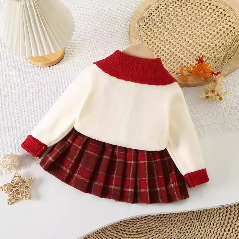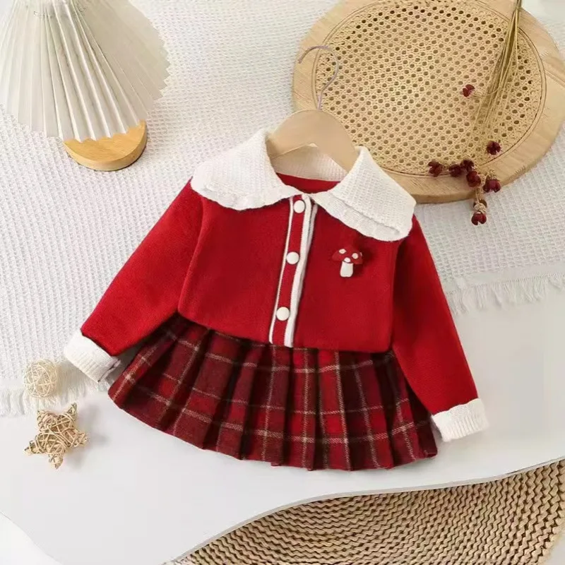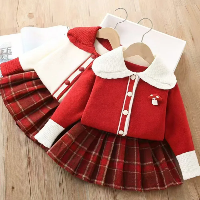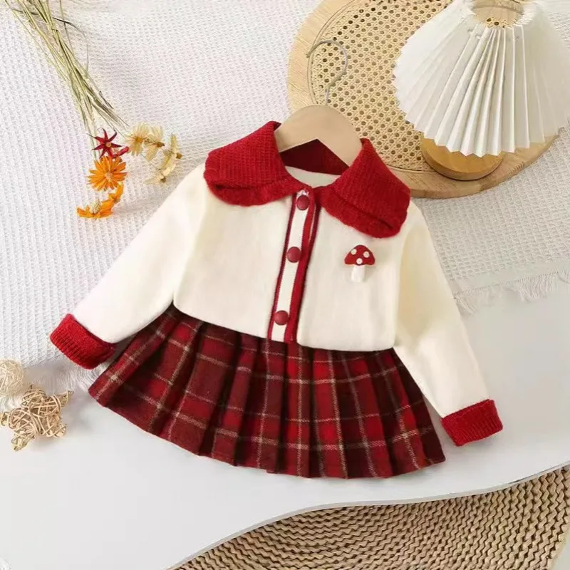 Casual Style Girls' Sweater Set Cute Mushroom Knit Long Cardigan and Solid Dress for Winter Anti-Pilling