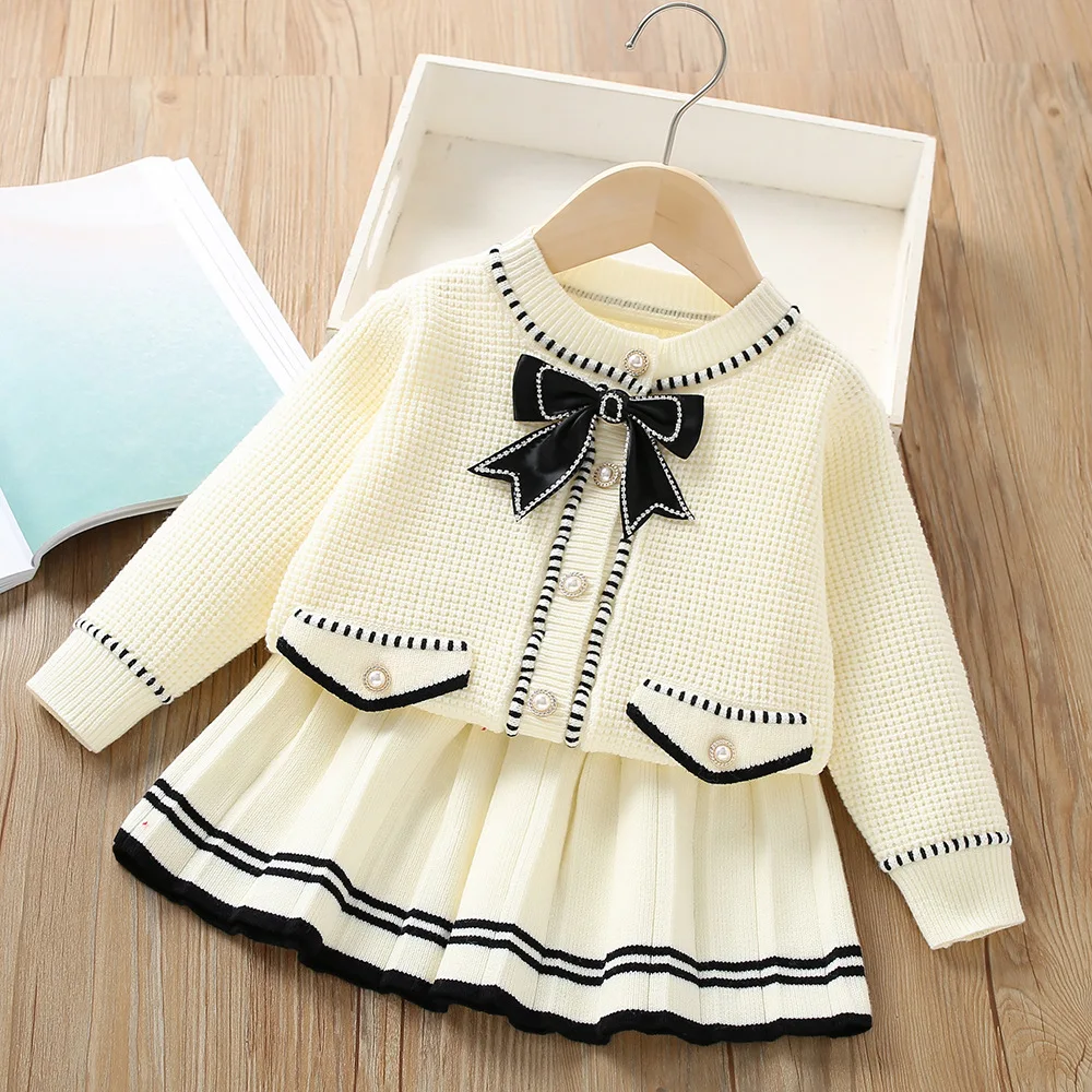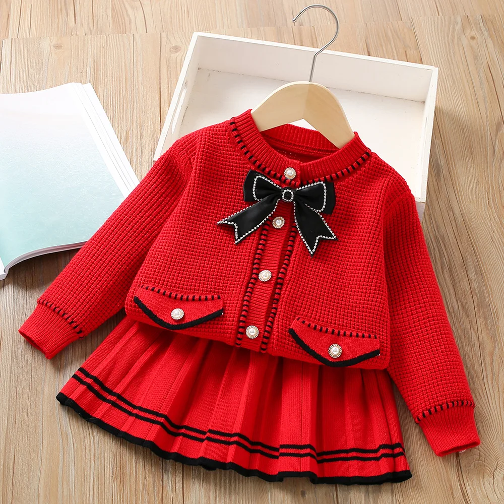 Stylish Black Bow Knitted Plaid Sweater Skirt Set Flap Pocket Preppy Style Girls Sweet Autumn Winter Babies' Clothing