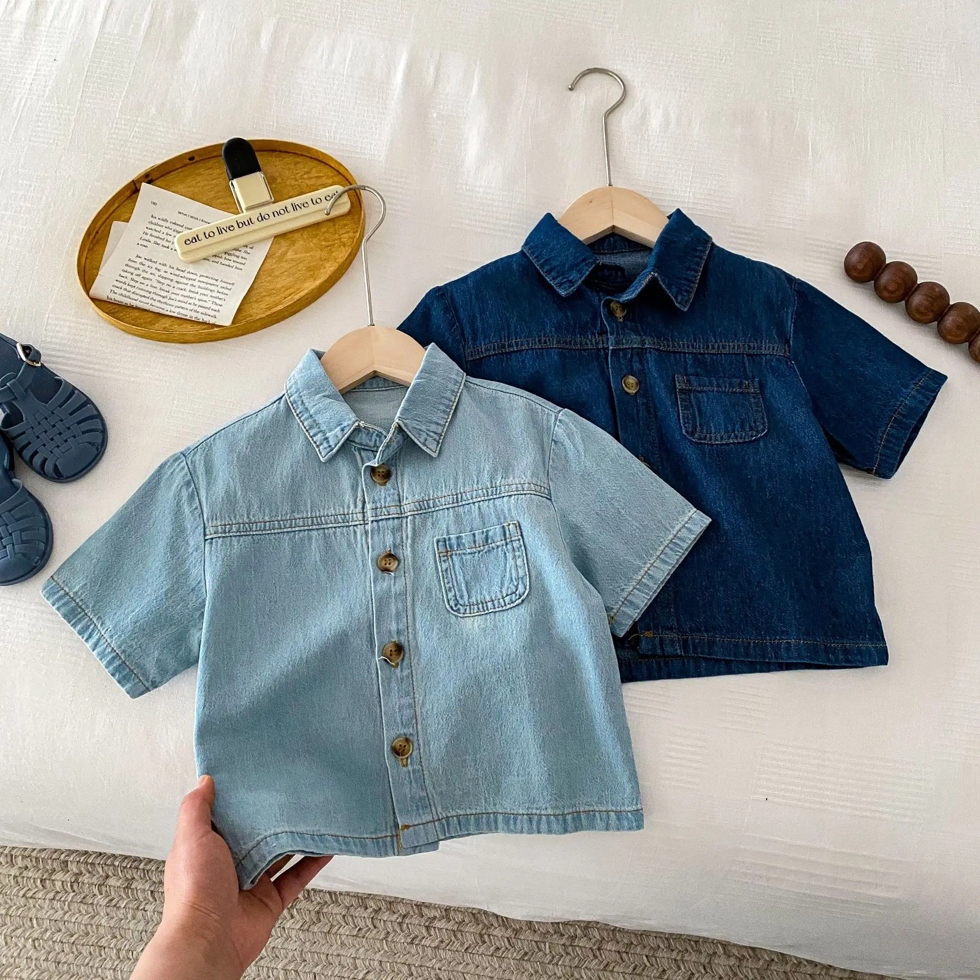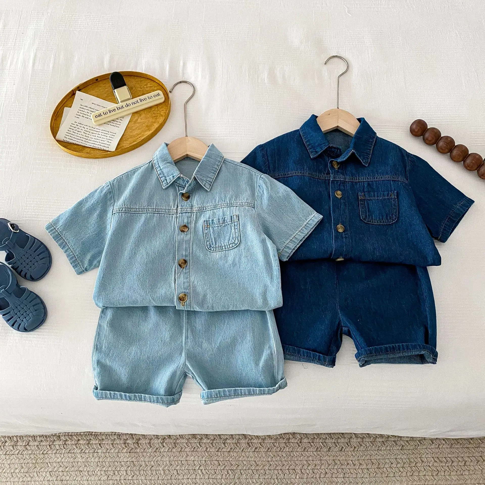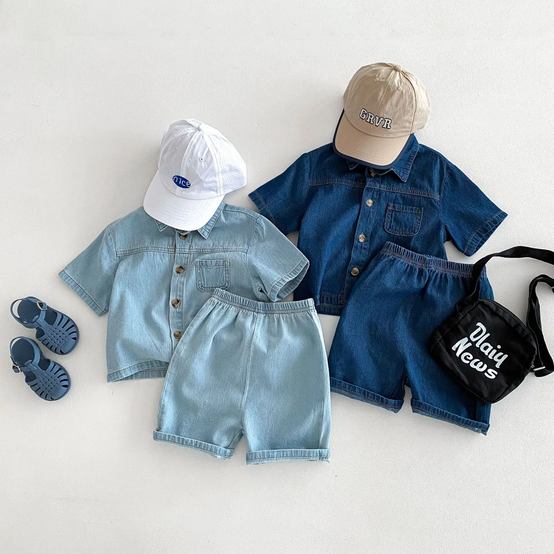 Summer New Children Casual Print Two-Piece Set Boys and Girls Short-Sleeved Denim Pants with Treasure Suit