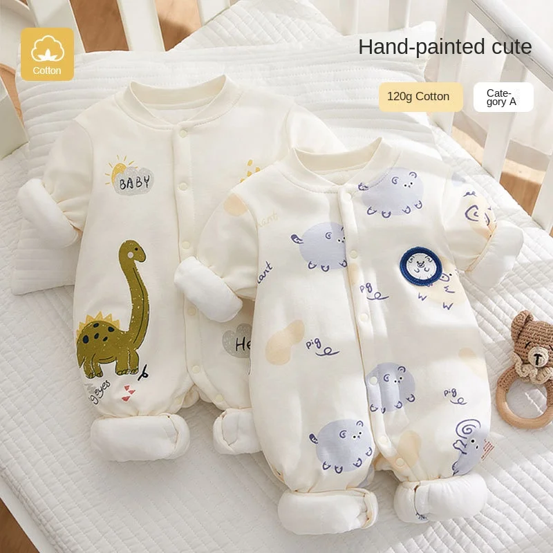 Thickened Winter 120g 100% Cotton Baby Jumpsuit Warm Button Closure Animal Pattern Climbing Clothes