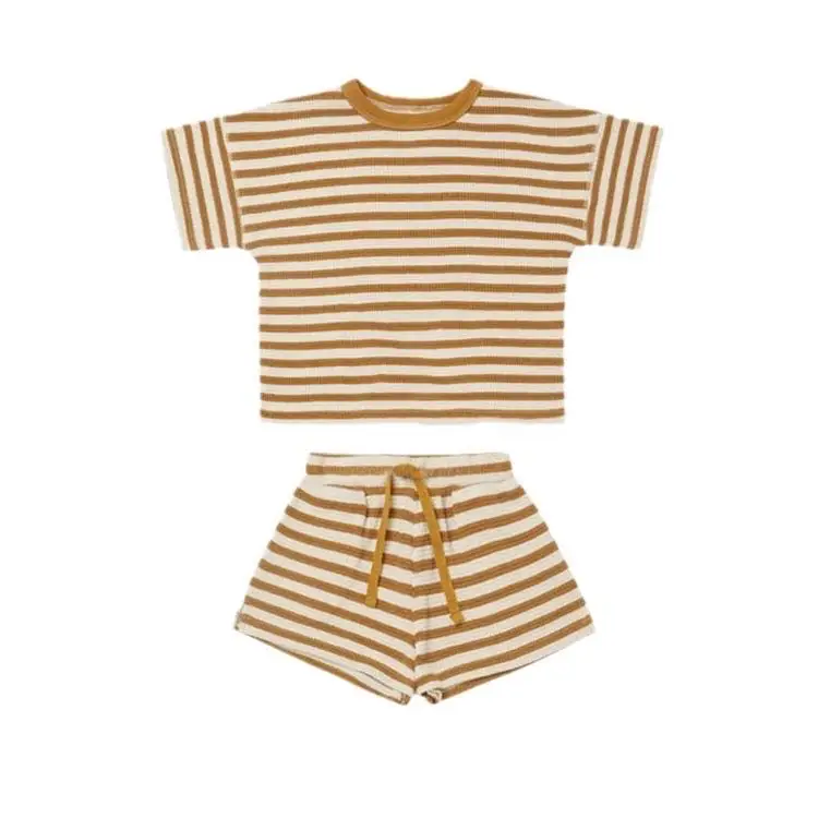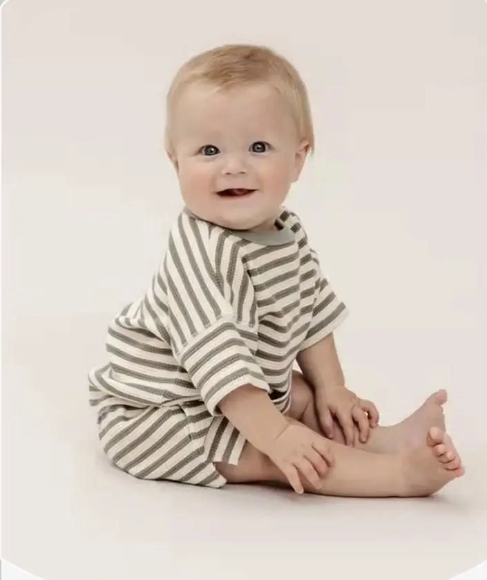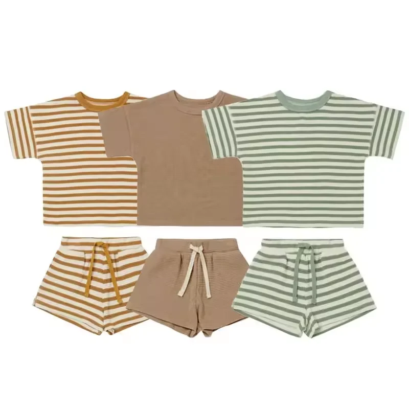 Summer Boy Children Clothing Short Sleeve Shorts 2Pcs Set Striped Waffle Cotton Baby Clothing Set