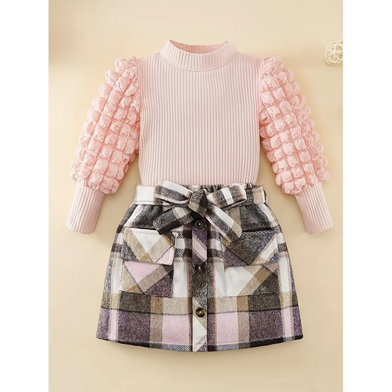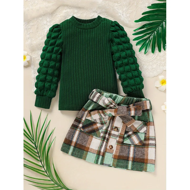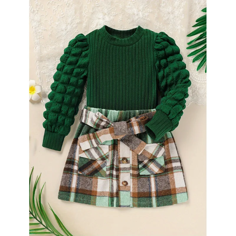 Girls' Plaid Clothing, Girls' Bubble Sleeves, Knitted Ribbed Shirt Top, Plaid Skirt Set, Children's Autumn and Winter Clothing