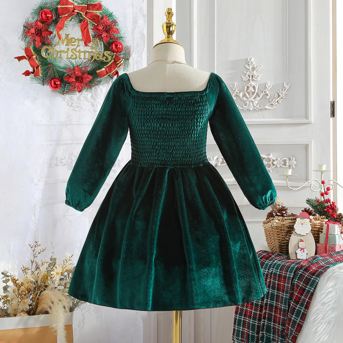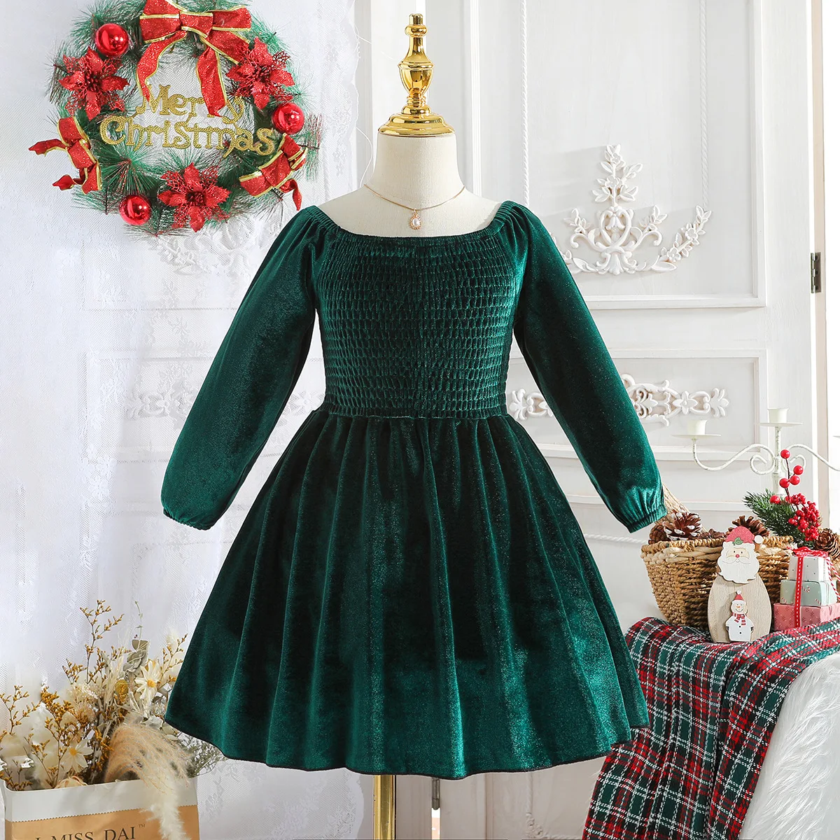 Foreign Trade Children's Wear Christmas Girl's Dress Autumn Winter New Velvet Crocheted Printed Long Sleeve Off-shoulder Dress