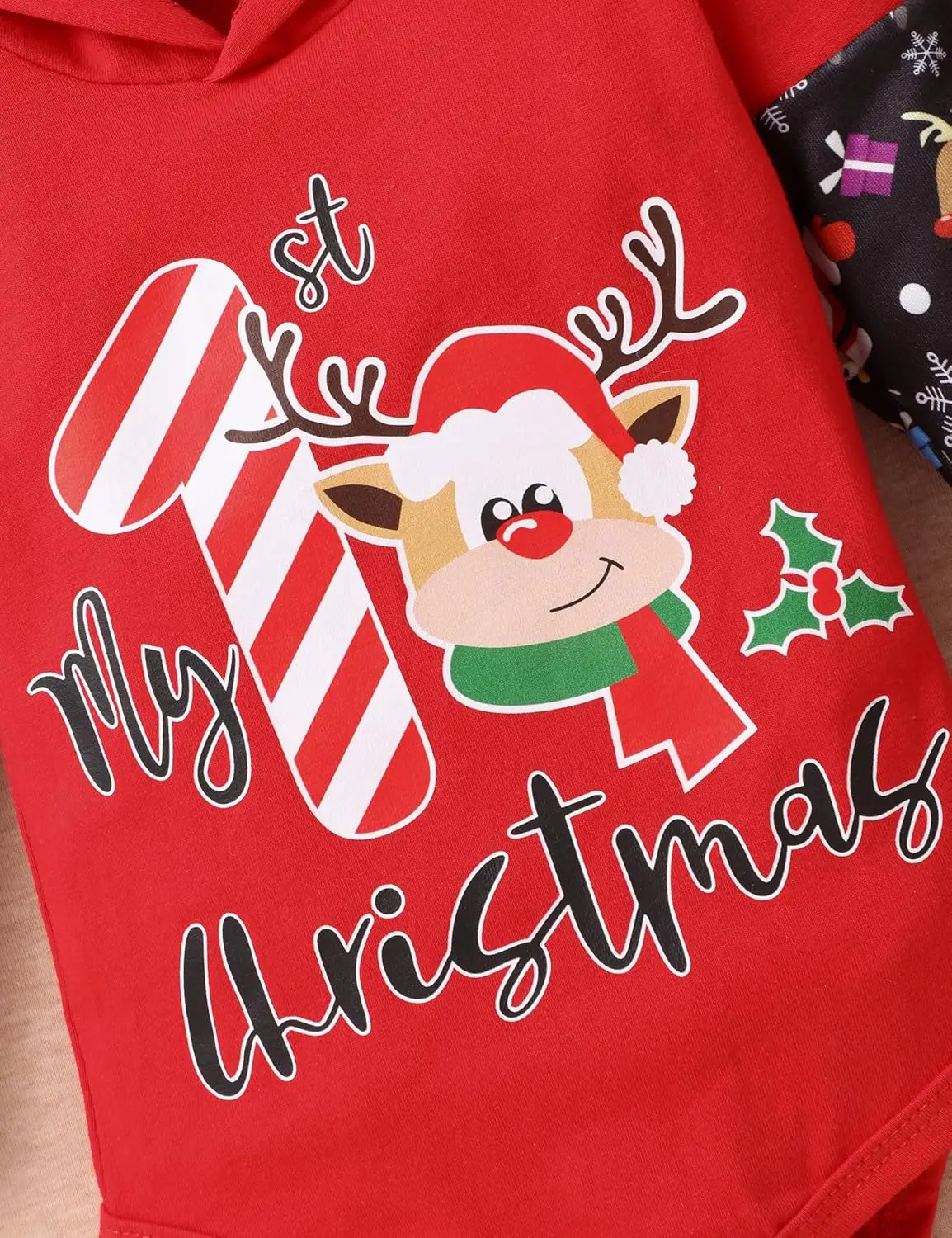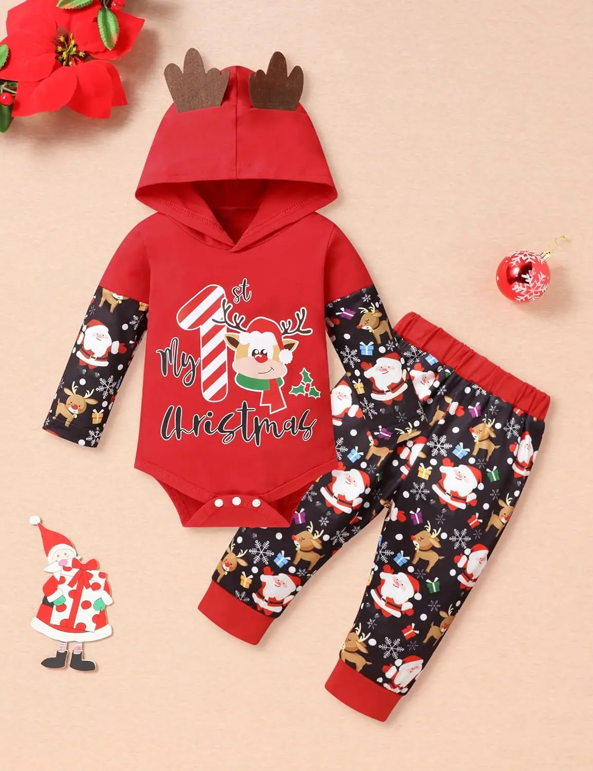 Baby Boy Outfit My 1St Christmas Cartoon Print Romper Pants and Hat 0-12M Clothes Sets