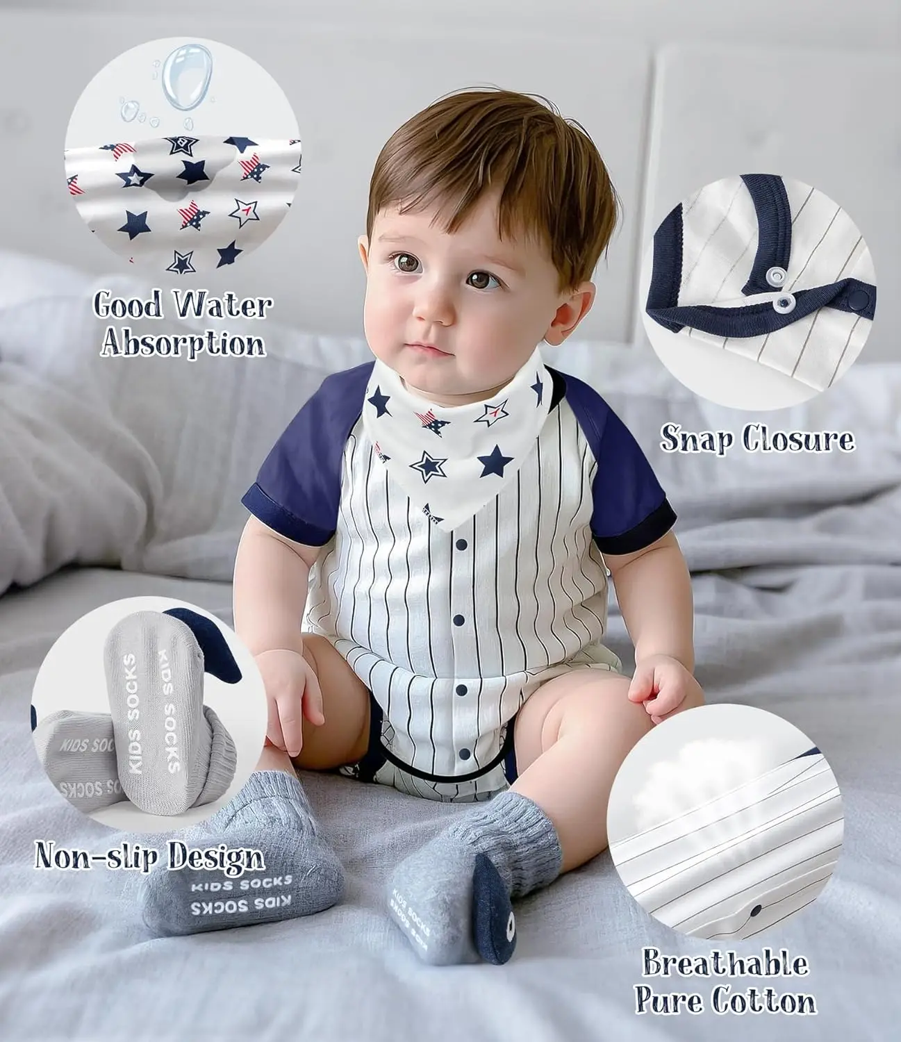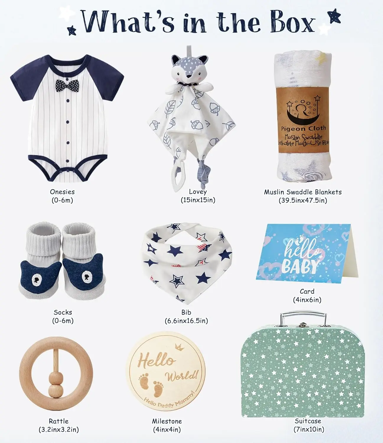Baby Boy Gift Basket Set 9-Piece Newborn Essentials Fox Lovey Blanket Onesie Wooden Rattle Socks Bib Suitcase 0-6 Months