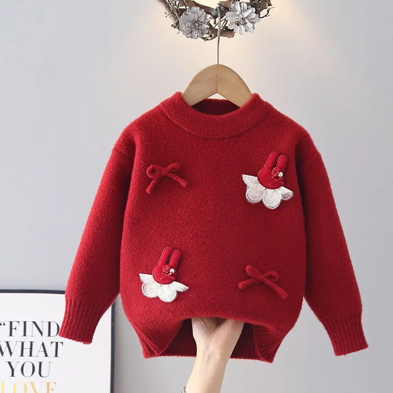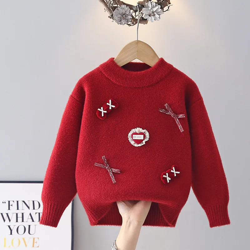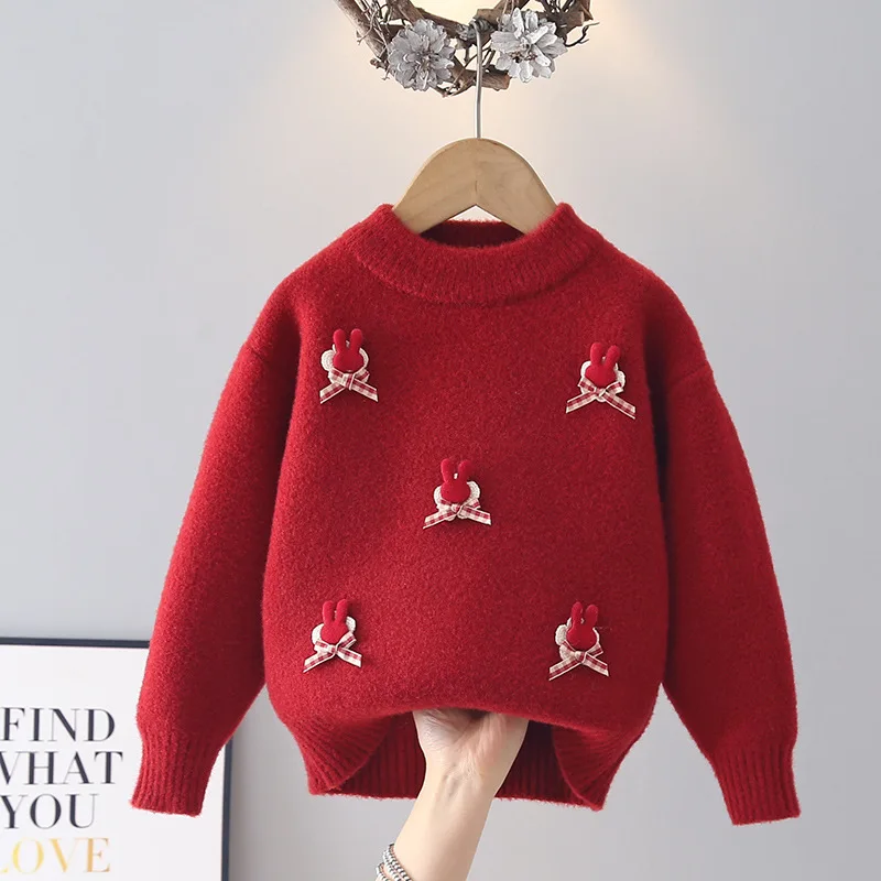 Girls' Sweater Autumn 2026 New Red Korean-style Crewneck Thickening Knitted Base Shirt Children's Neck Pullover Top Trendy