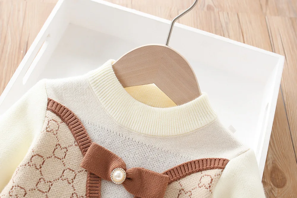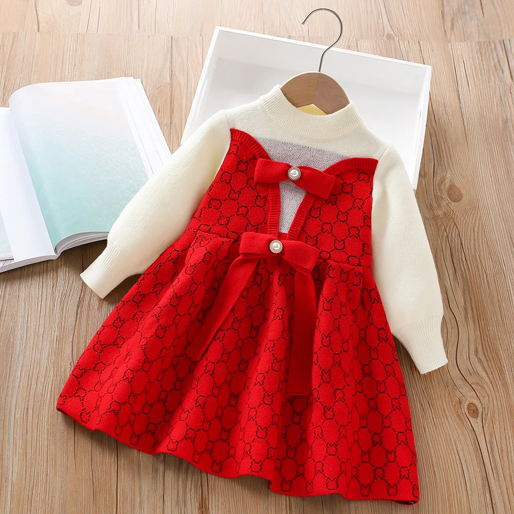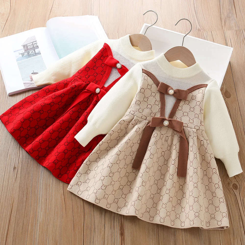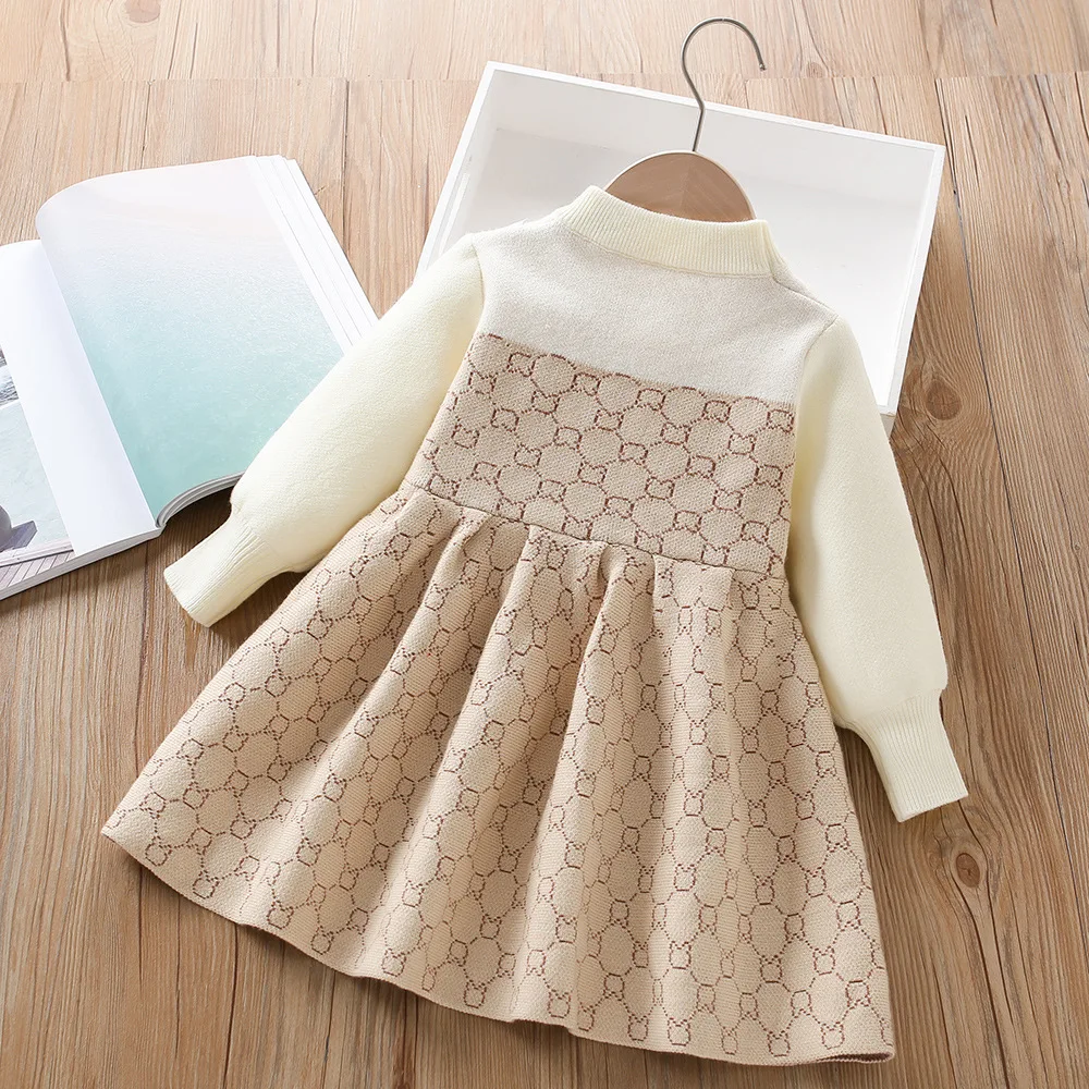 Girls' O-neck Sweet Print Knee-Length A-line Sweater Dress for Children Autumn/Winter Breathable New Style Top Brand