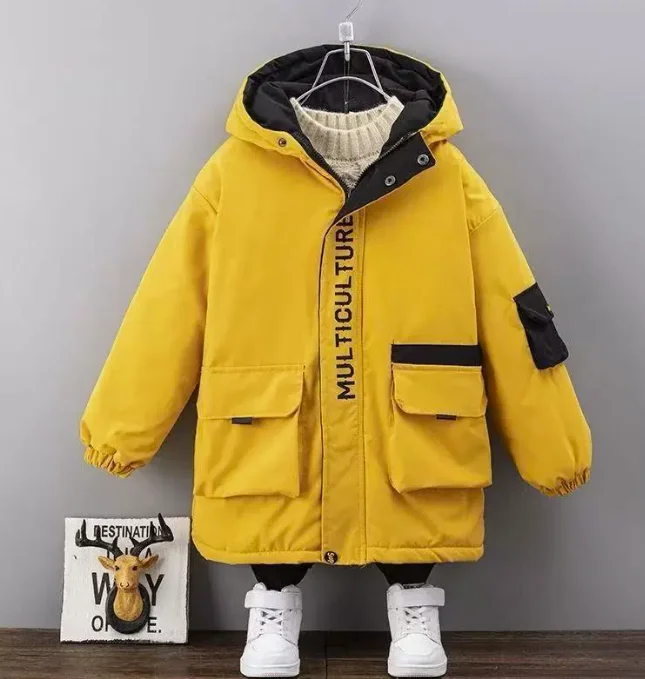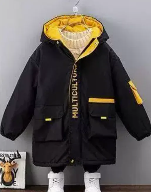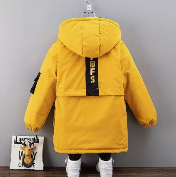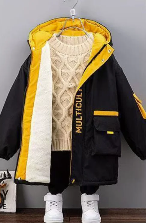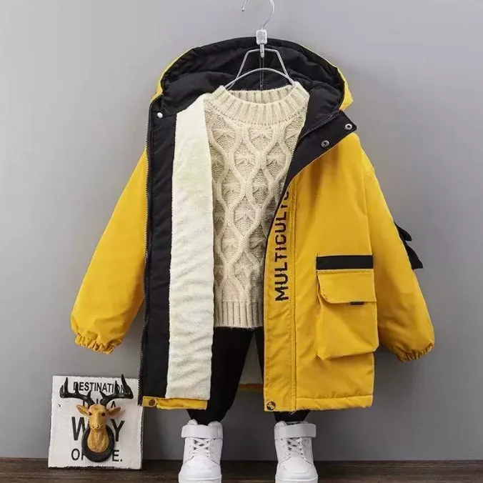 Kids Winter Parka Jackets for Boys Hooded Students Fleece Padded Long Coats Warm Outfits for Children 3-13 Years Zipper Closure