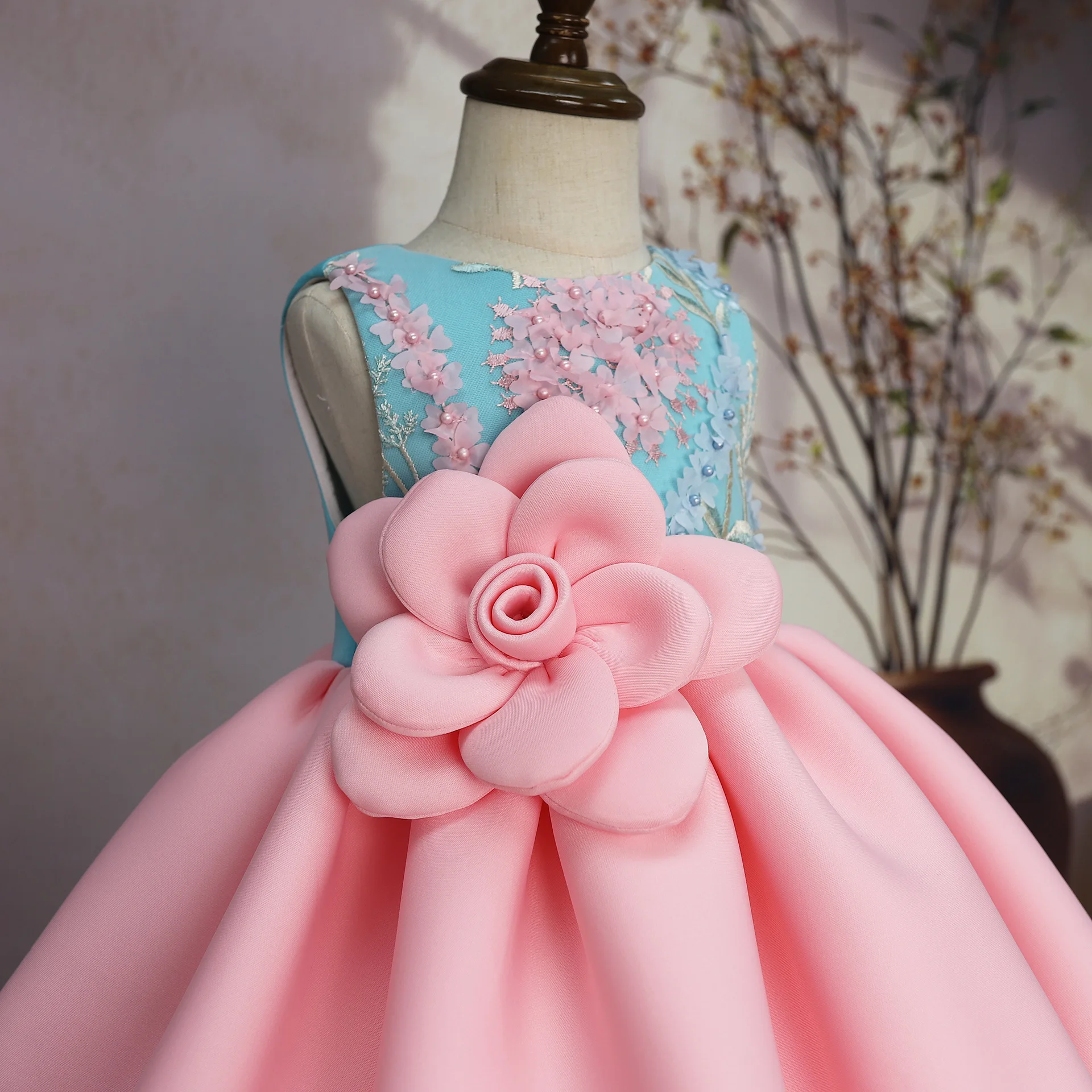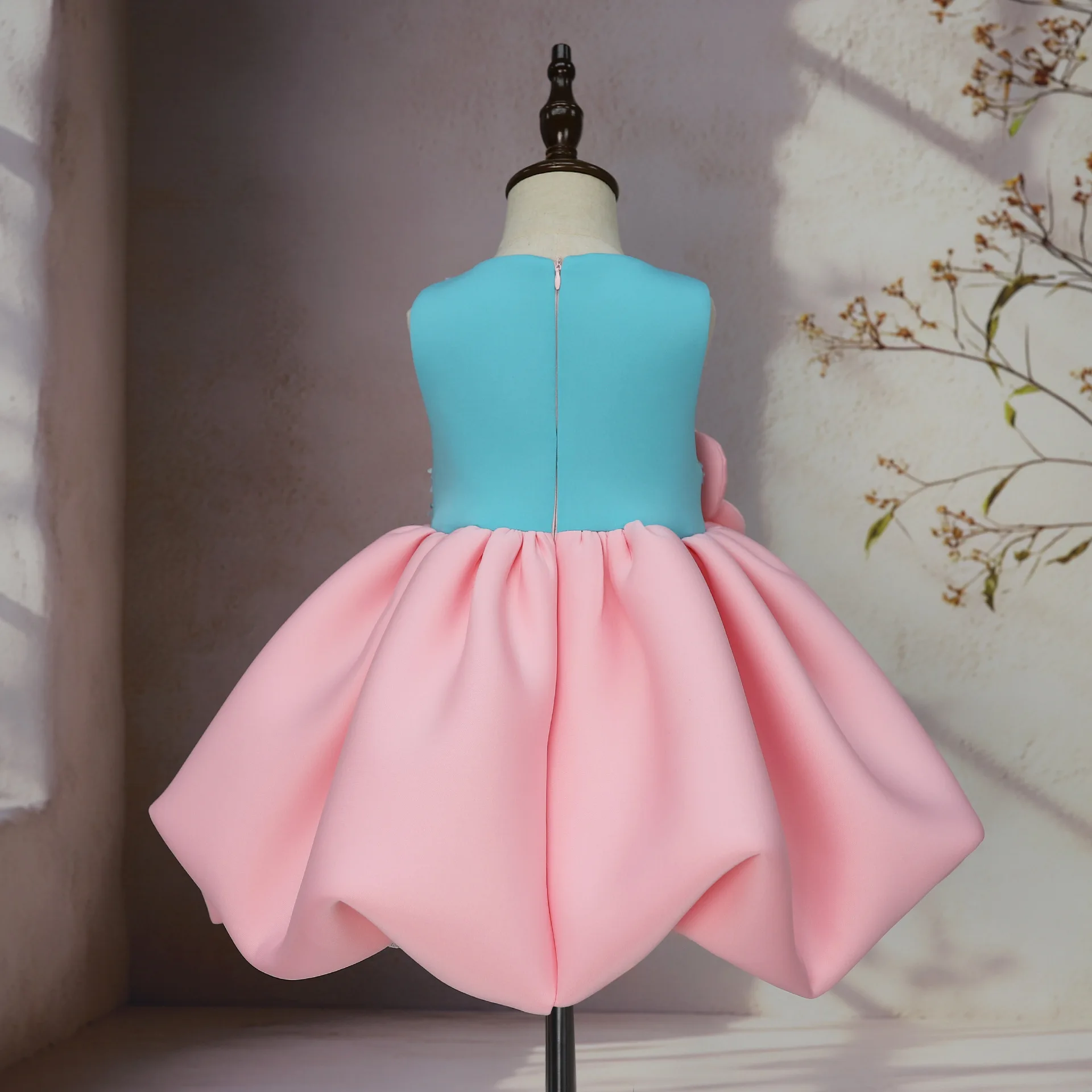 2026 Fluffy Bow Decoration Birthday Party Dress Satin High Quality Children Girl O-Neck New Summer Blue Big Flower Appliqued