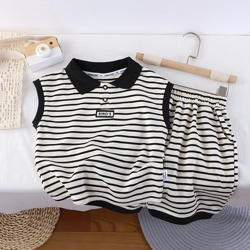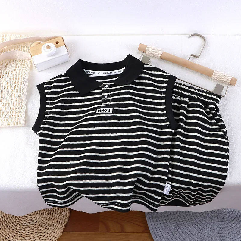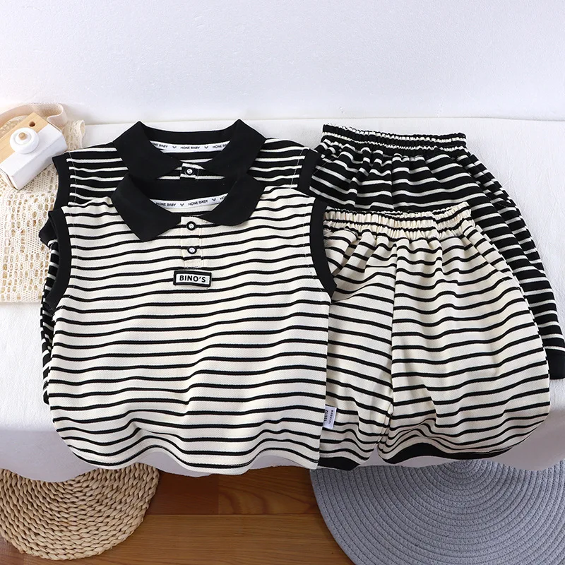 2026 Children's Summer Sleeveless Black and White Striped Suit with POLO Collar for Middle Boys and Girls