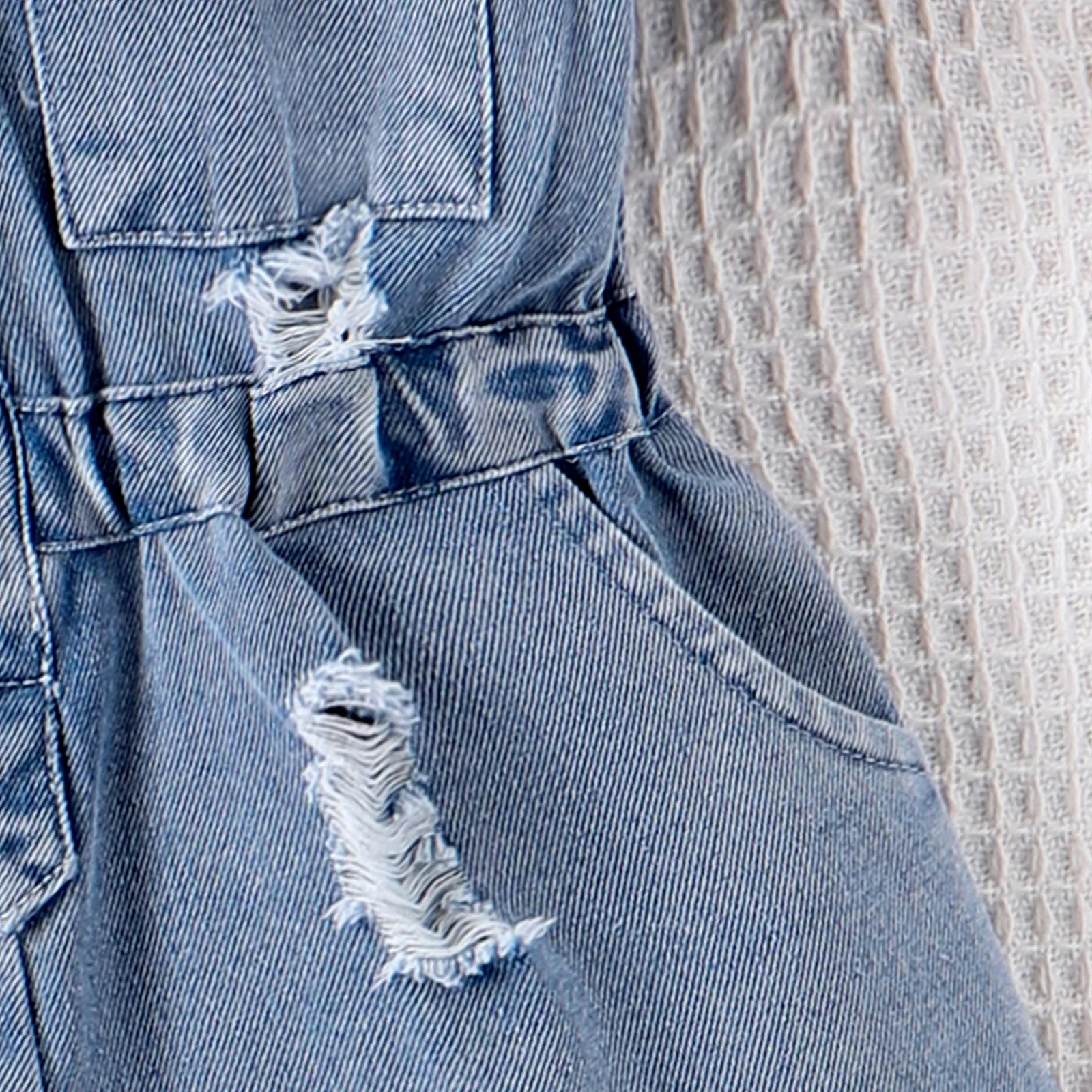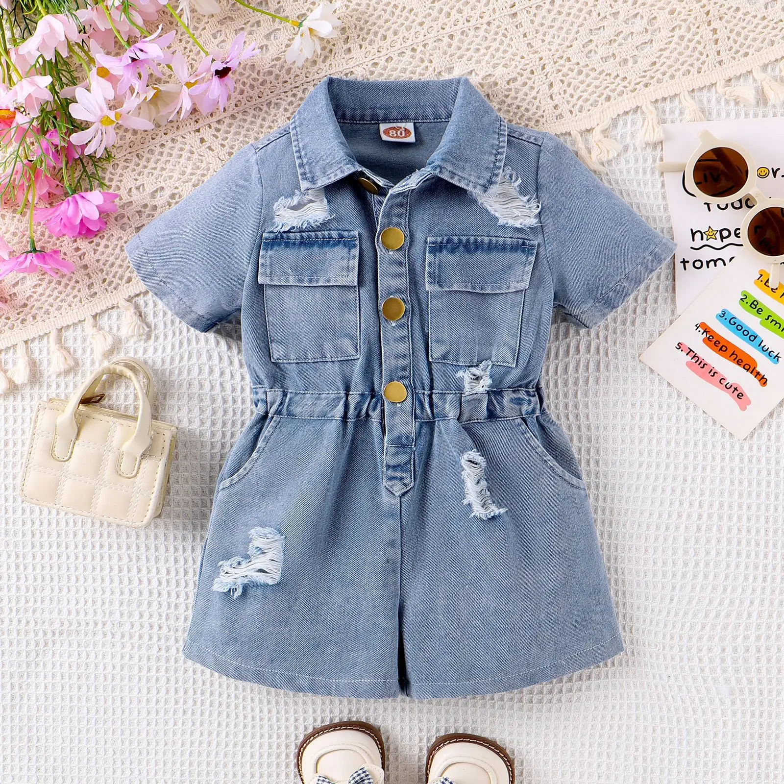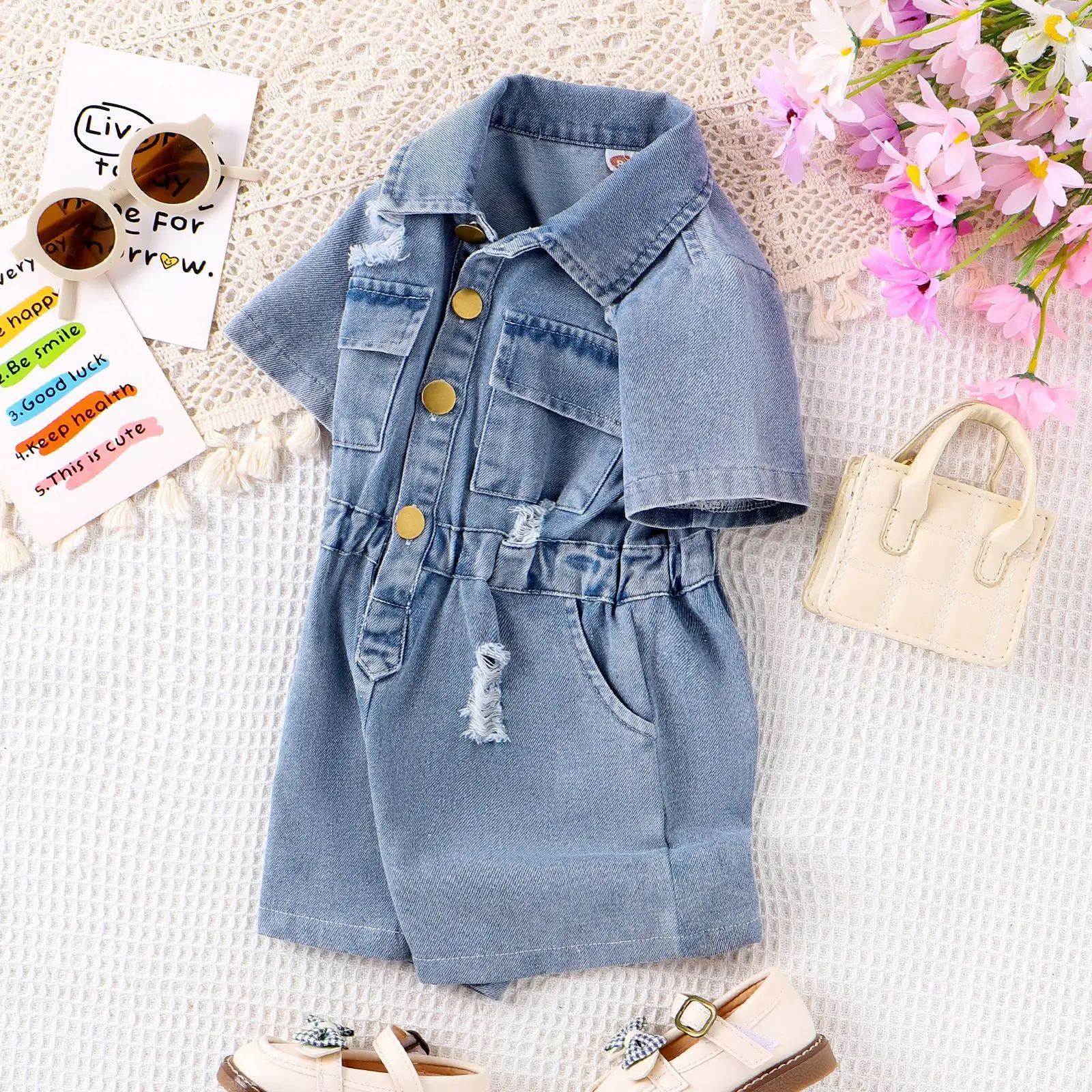 2026 Hot Selling Summer Baby Girls' Denim Jumpsuit Distressed Short Sleeve Romper with Turn-Down Collar & Waist Cinched Design