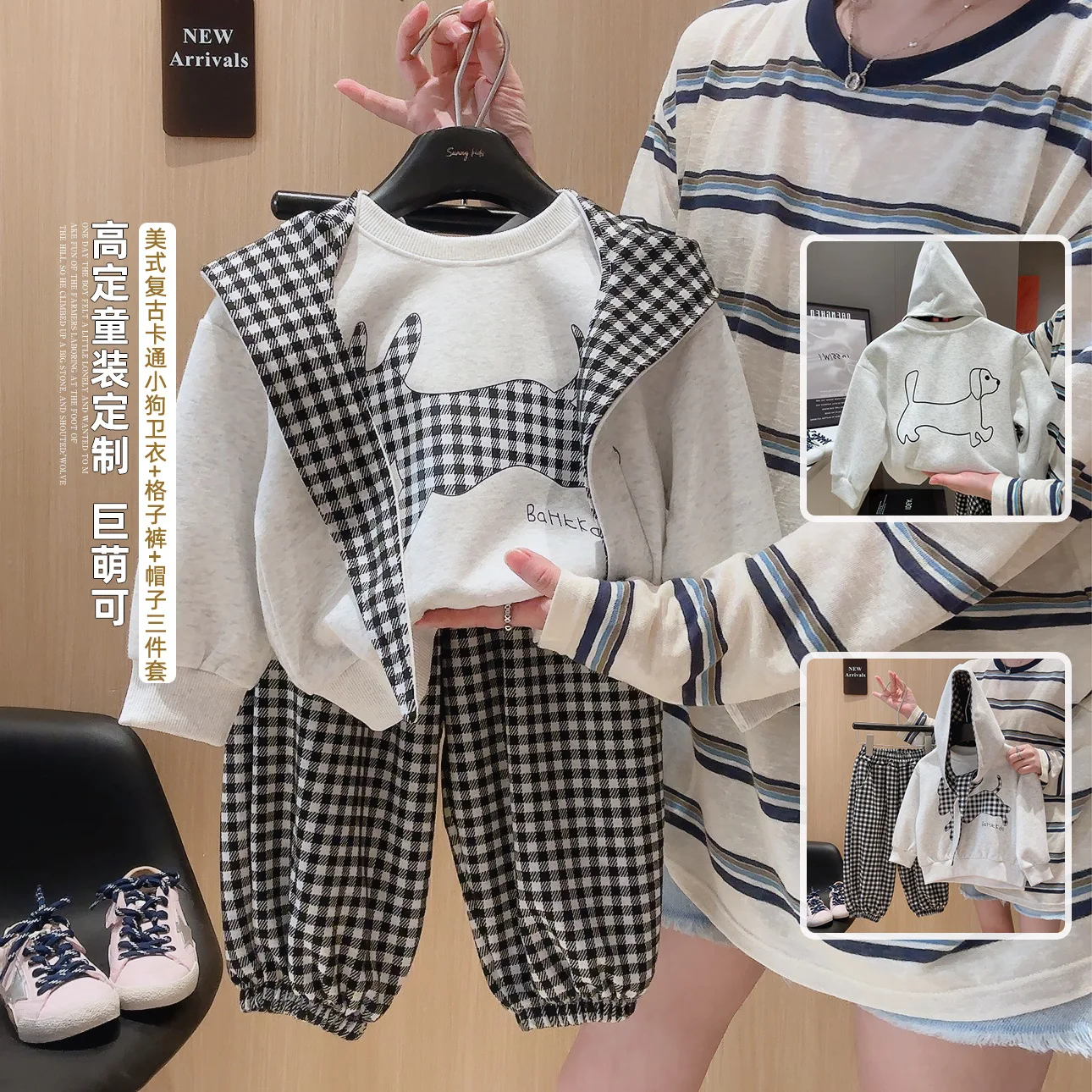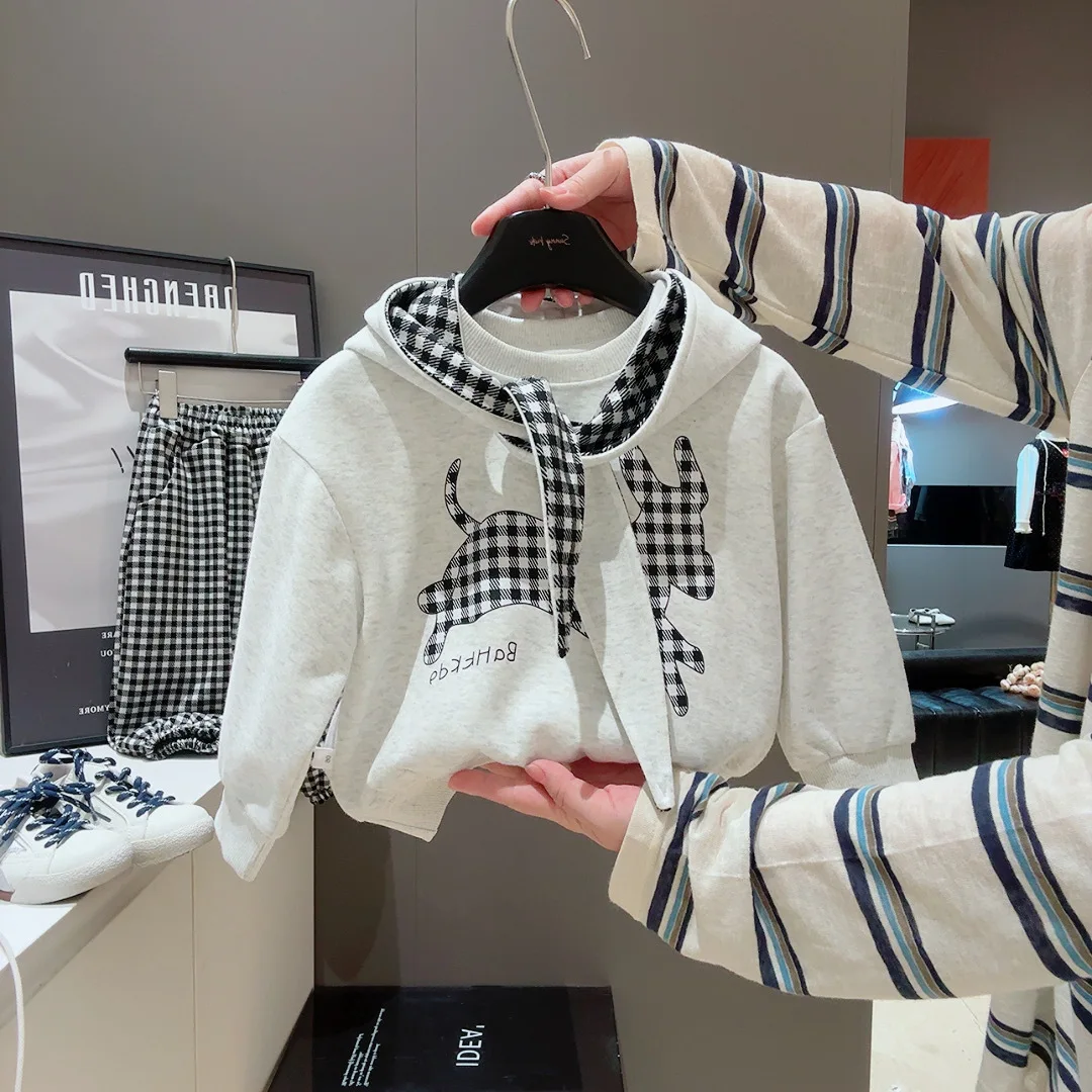 Children's Hooded Sweatshirt Set - Autumn Boys and Girls Casual Sweatshirts with Children's Checkered Pants Three-piece Set