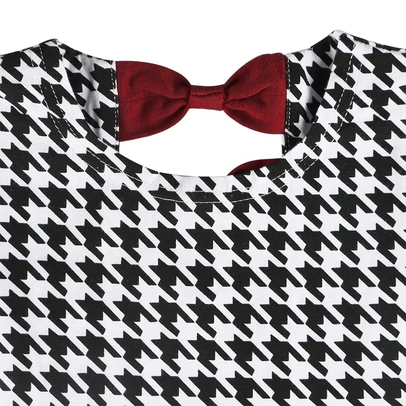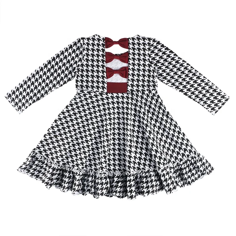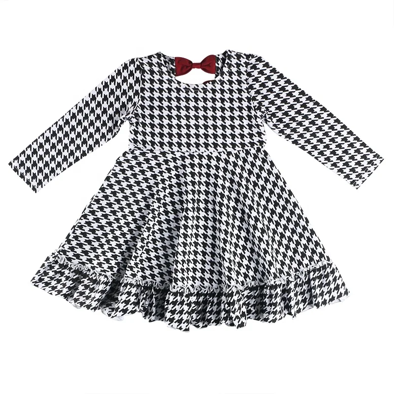 Newest Design Kid Clothes Cotton Houndstooth Graphic All Over Long Sleeves Ruffle Hem Boutique Children Forck Baby Girl Dress