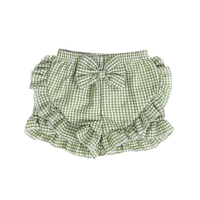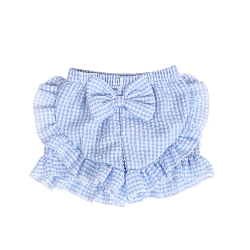 Hot Sale Kid Clothes Seersucker Candy Color with Bowknot Back Ruffle Trim Children Summer Shorts Baby Girl Boutique Shorts